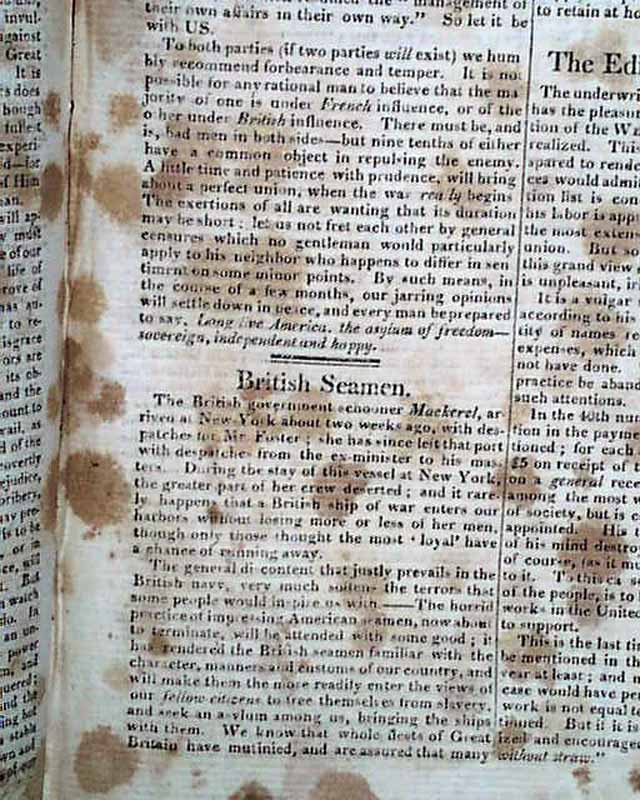 Most of the first column of the front page is a somewhat decorative "Proclamation" headed with an engraving of a heraldic eagle & signed by James Madison, declaring that a state of war exists between the United States & England, marking the official beginning of the War of 1812. Inside has a nice editorial: "War Against England" which takes close to 2 pages and includes near the end: "War is Declared--Great Britain is the Enemy..." and at the very end: "...and every man be prepared to say, Long live America, the asylum of freedom--sovereign, independent and happy." (see photos).