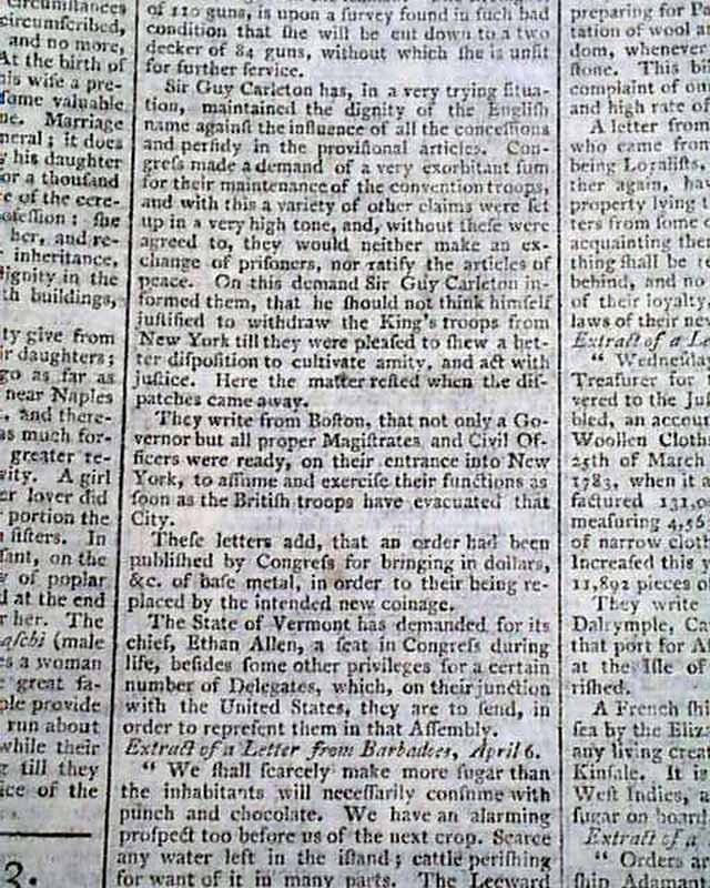 Page 2 has a report on the difficulties in ironing out final details for the treaty of peace and the British leaving New York. Bits include: "Sir Guy Carleton has, in a very trying situation, maintained the dignity of the English name against the influence of all the concessions & perfidy in the provisional articles. Congress made a demand of a very exorbitant sum...Guy Carleton informed them that he should not think himself justified to withdraw the King's troops from New York till they were pleased to shew a better disposition to cultivate amity & act with justice..." Also a note: "The State of Vermont has demanded for its chief, Ethan Allen, a seat in Congress during life, besides some other privileges...".