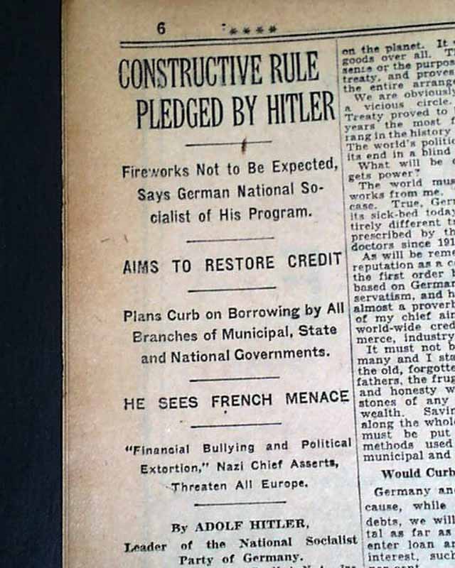 The top of the front page has a two column heading: "'Nazis' Would Assure Nordic Dominance, Sterilize Some Races, Ban Miscegenation" See images for text here. This is a early prediction of what the Nazis ultimately tried & actually succeeded in doing in Nazi Germany.