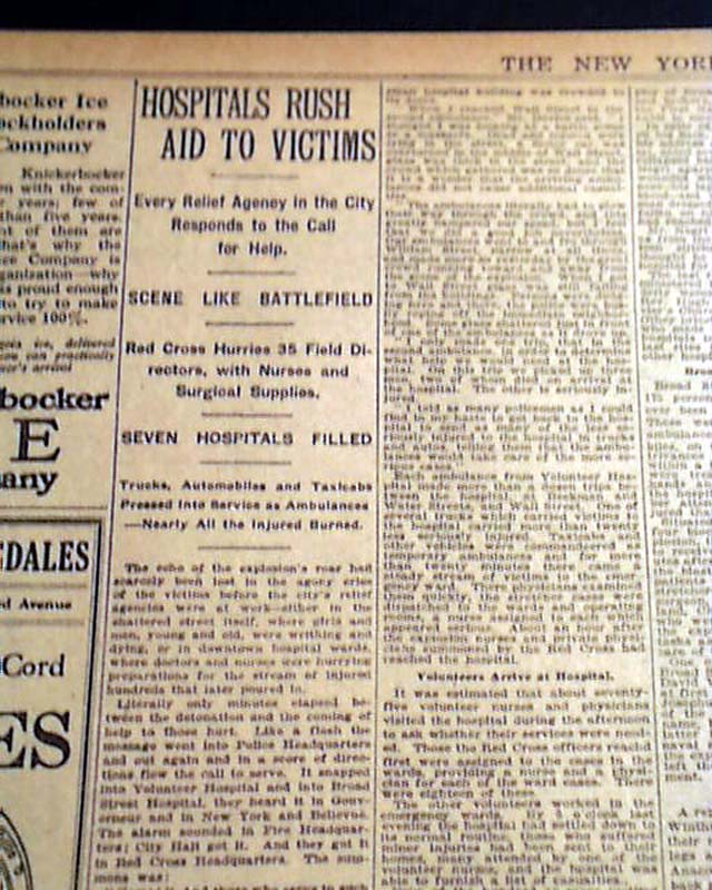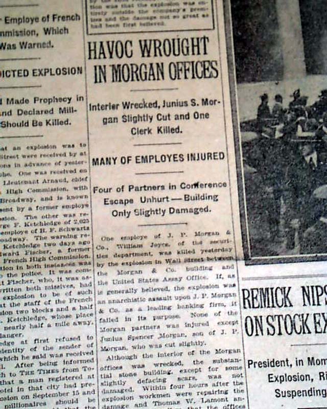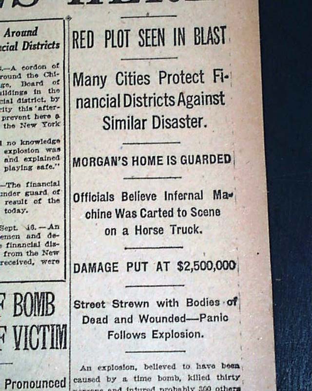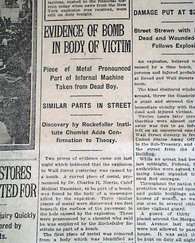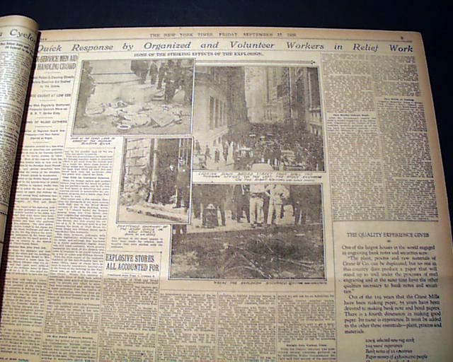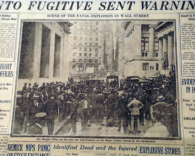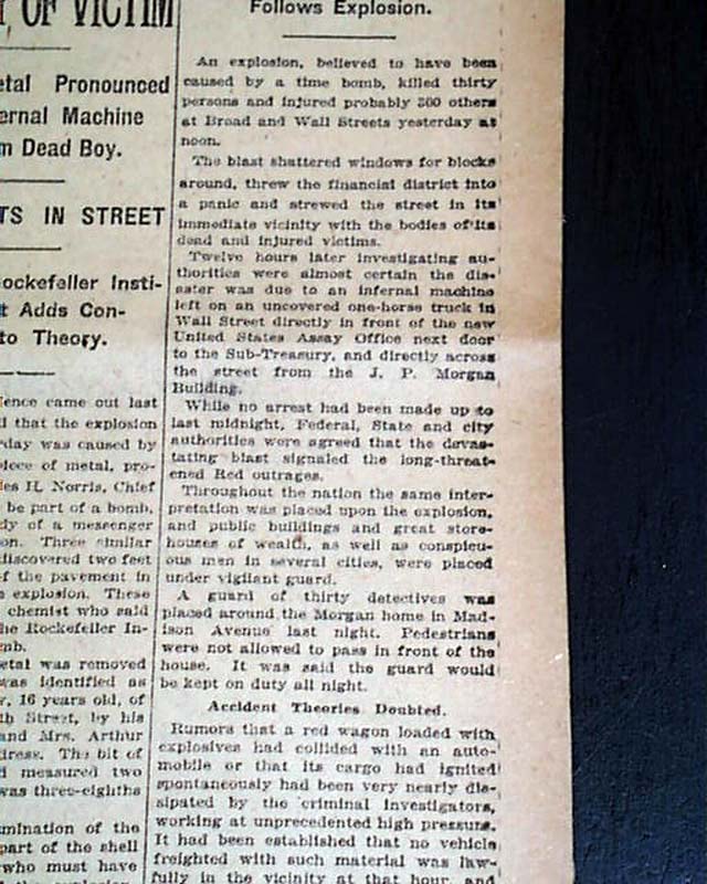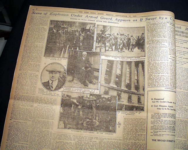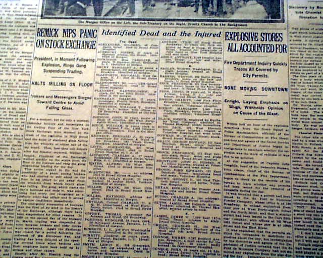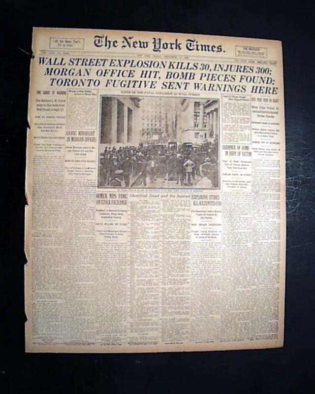 The front page has a nice banner headline announcing: "WALL STREET EXPLOSION KILLS 30, INJURES 300; MORGAN OFFICE HIT, BOMB PIECES FOUND; TORONTO FUGITIVE SENT WARNINGS HERE" with many subheads and photo. Much more on the following pages. Always nice to have notable events in history reported in this World famous publication, especially on this event.