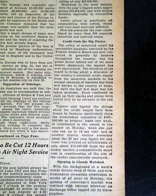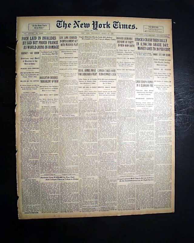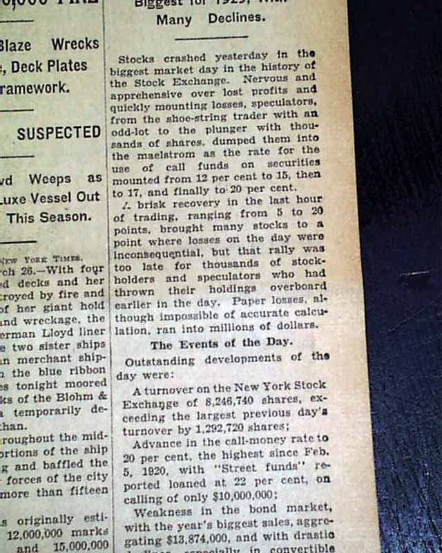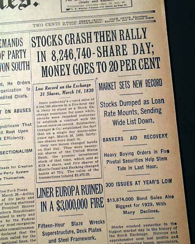 The front page has a two column headline: "STOCKS CRASH THEN RALLY IN 8,246,740-SHARE DAY; MONEY GOES TO 20 PER CENT" with subheads. (see) Nice to have in this famous NYC title. If they only knew what was to come a few months later.