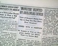The top of page 6 has a one column heading: "'MONSTER' HUNTED BY ARKANSAS DIVER" with subheads that include: "Town of Newport Makes Holiday as Deep Sea Man Seeks River 'Creature'" and more. (see)
