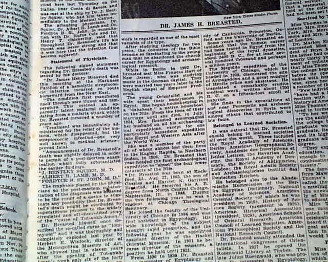 The top of page 25 has a one column heading: "DR. BREASTED DIES; NOTED ORIENTALIST" with subheads and photo. (see) Lengthy 1st report coverae on the death of James Henry Breasted, American archaeologist, Egyptologist and historian.