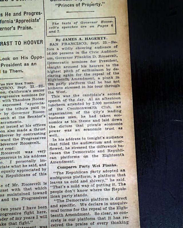 The top of the front page has a three column headline: "ROOSEVELT RENEWS DEMAND FOR REPEAL; PRAISES SMITH AMID CHEERS OF 16,000; TAMMANY DECIDES TO FIGHT FOR GOVERNOR" with subheads that include: "Nominee Gets Ovation" "Speech in San Francisco Auditorium Evokes Wild Enthusiasm" & more. Text of speeches on pages 6 and 7 with related photo. Loads of text here. Always nice to have notable events in history reported in this World famous publication.