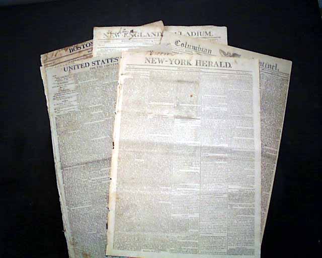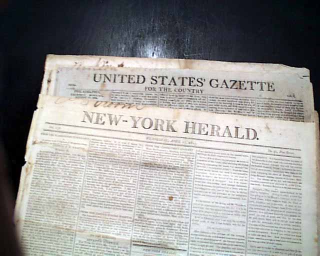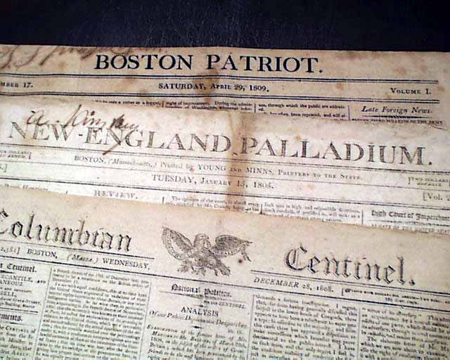 Five very early 19th century American newspapers: New York Herald, April 27, 1803; United States' Gazette, Aug. 17, 1809; Columbian Centinel, Dec. 28, 1808; New England Palladium, Jan. 15, 1805; and Boston Patriot, April 29, 1809. All five are good "newsy" newspapers of folio size, 4 pages, some margin tears, generally good condition. A nice set of five different, early newspapers.