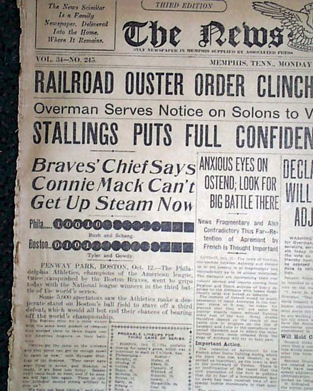 The News Scimitar dated October 13 has the dramatic front page, "BRAVES WIN," which tells of the 1st time in history (to-date) that a team won the World Series in four straight games (see images). Tons of details and the box score are included on the front page, with more on inside pages.