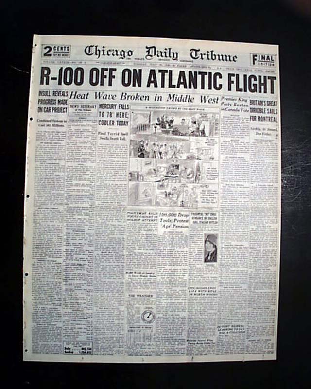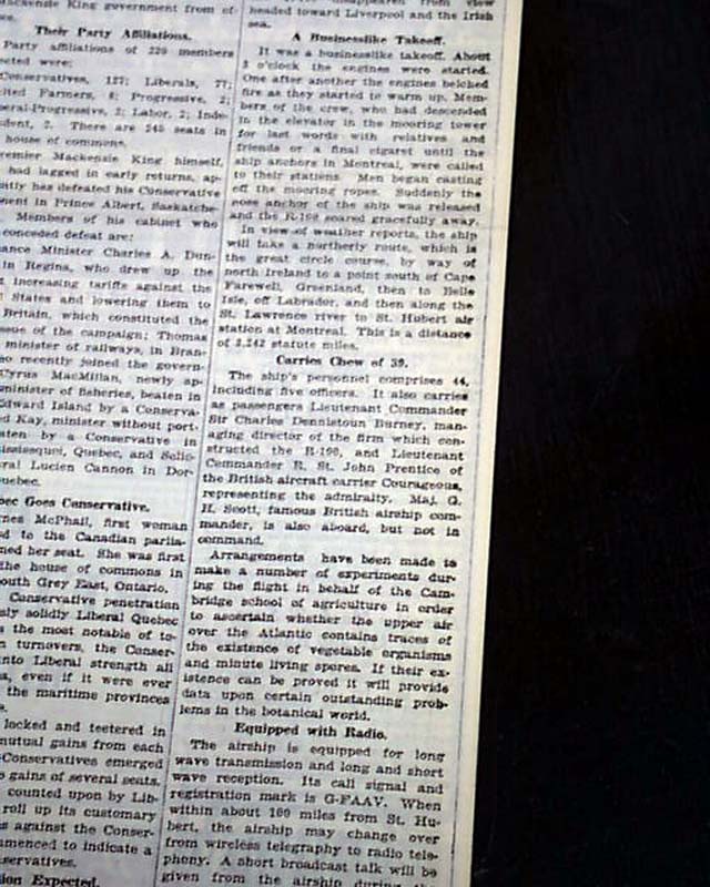 The front page has a nice banner headline: "R-100 OFF ON ATLANTIC FLIGHT" with subheads. (see) Nice for display. Five related photos on the back page.