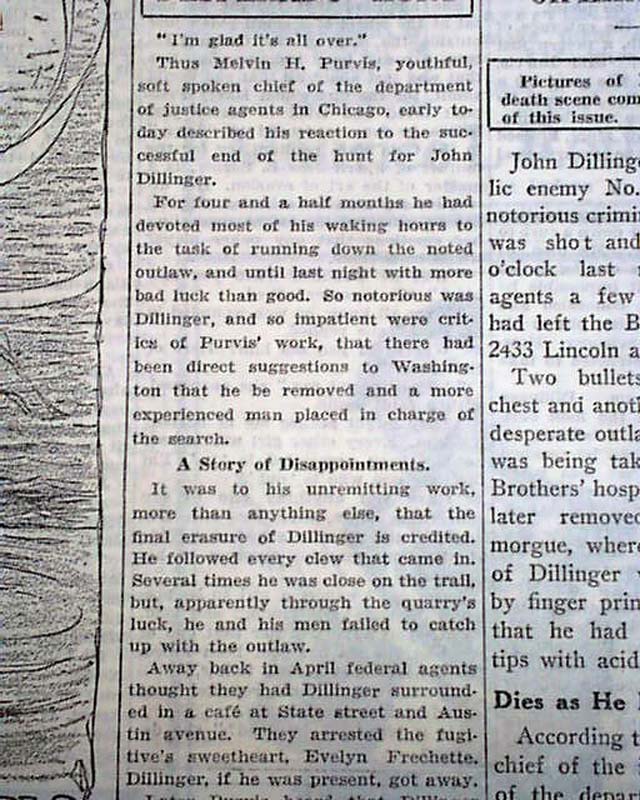 Because he was slain in Chicago, it is not surprising that the extent of coverage is considerable. The report carries over to pages 2 and 3 where additional articles are found including: "Crowd Storms Morgue To See Outlaw's Body" "Reveal Dillinger Seared Fingers in Acid" "Witness Tells How Dillinger Went To Death" "All Happened in Split Second, He Says" "John Dillinger Legend Born of His  Daring Deeds" "Audacity in Crime  seizes Public Imagination" "Dillinger Death Brings Elation To Cummings" "Dillinger Fine Chap, Says Mary Kinder, Harry Pierpont's Girl" "Here Are the High Points  in Life of John Dillinger".