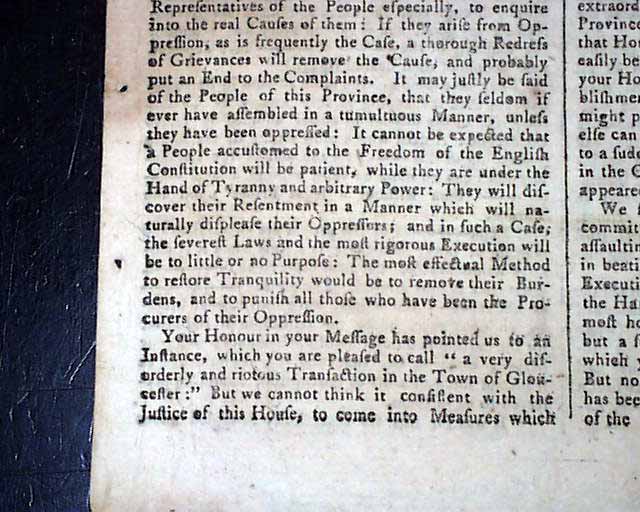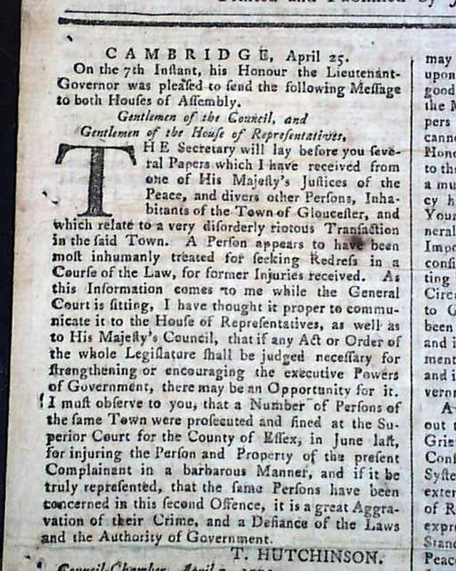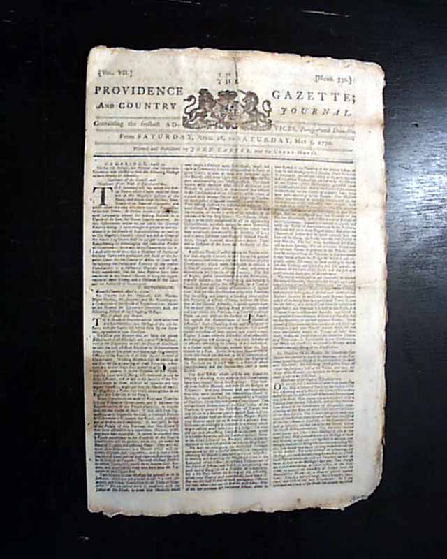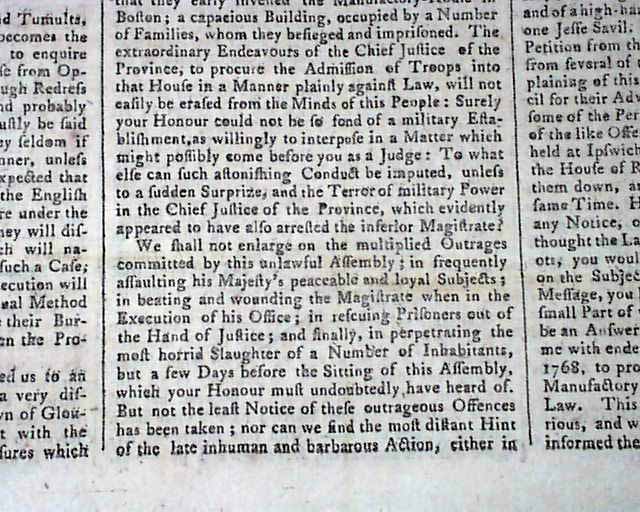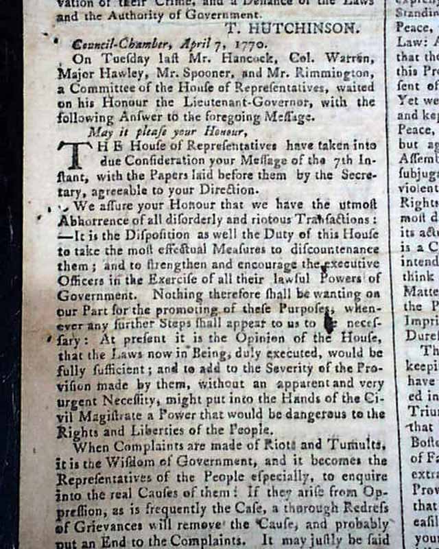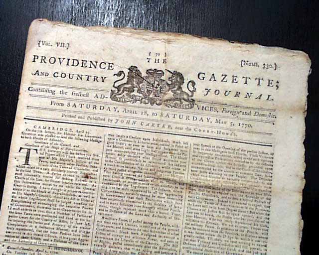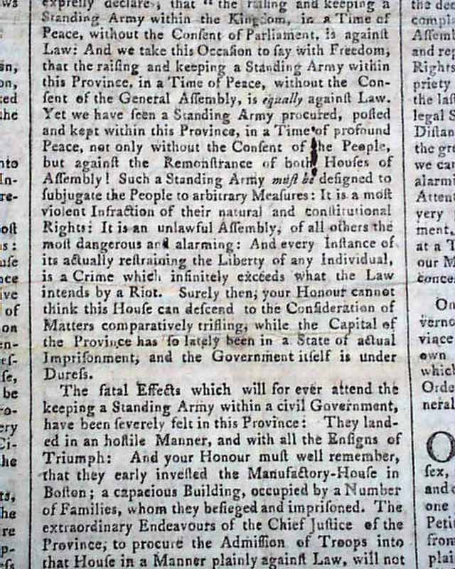 PROVIDENCE GAZETTE & COUNTRY JOURNAL, Rhode Island, May 5, 1770 The entire front page and a bit of page 2 are taken up with addresses from the people of Boston (John Hancock among them) and the Lt. Governor of Massachusetts concerning differences between them, with a focus on the positioning of British troops in the town. One paragraph begins: "A military force, if posted among the people, without their express consent, is itself one of the greatest grievances & threatens the total subversion of a free system of corrupt and arbitrary power and even to exterminate the liberties of the country...". There is talk of a riotous situation in Gloucester, and some veiled references to the Boston Massacre of the previous month.