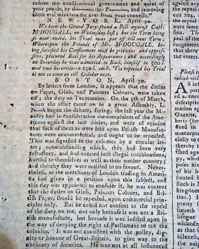 A report on page 3 concern the arrest of Capt. Alexander McDougall. McDougall was a patriot leader & member of the Sons of Liberty in New York. He wrote & printed an anonymous broadside "To the Betrayed Inhabitants" which criticized the Assembly. He was accused of libel & arrested serving two periods in jail
