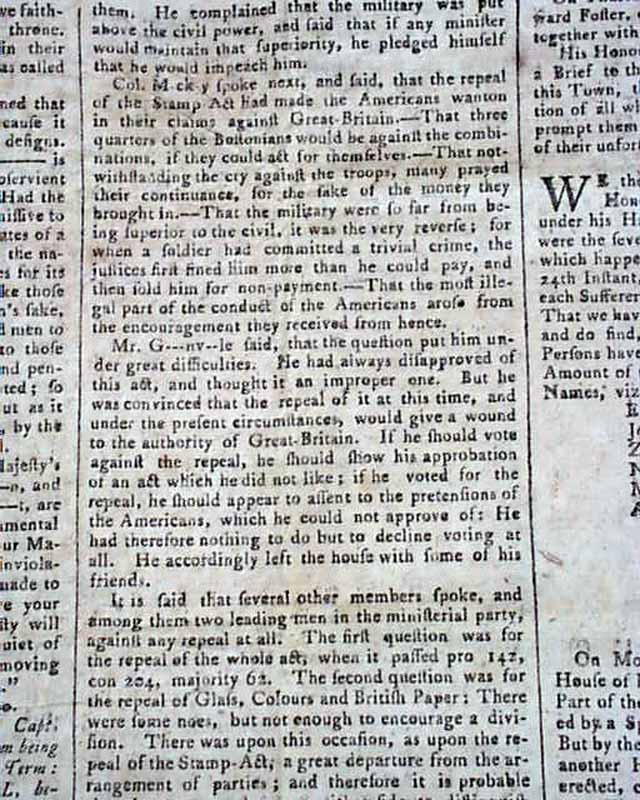 Another report begins: "By letters from London it appears that the duties on paper, glass and painters colours were taken off; the duty on tea remains..." with more discussion on this. Further on is: "and said that the repeal of the Stamp Act had made the Americans wanton in their claims against Great Britain..." and more.