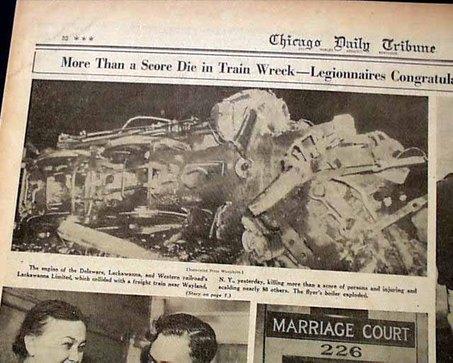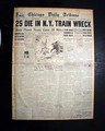 The front page has a great banner headline: "25 DIE IN N. Y. TRAIN WRECK" with subheads and small related map. Nice for display. Related photo on the back page. Always nice to have notable events in history reported in this World famous publication.