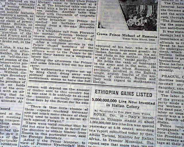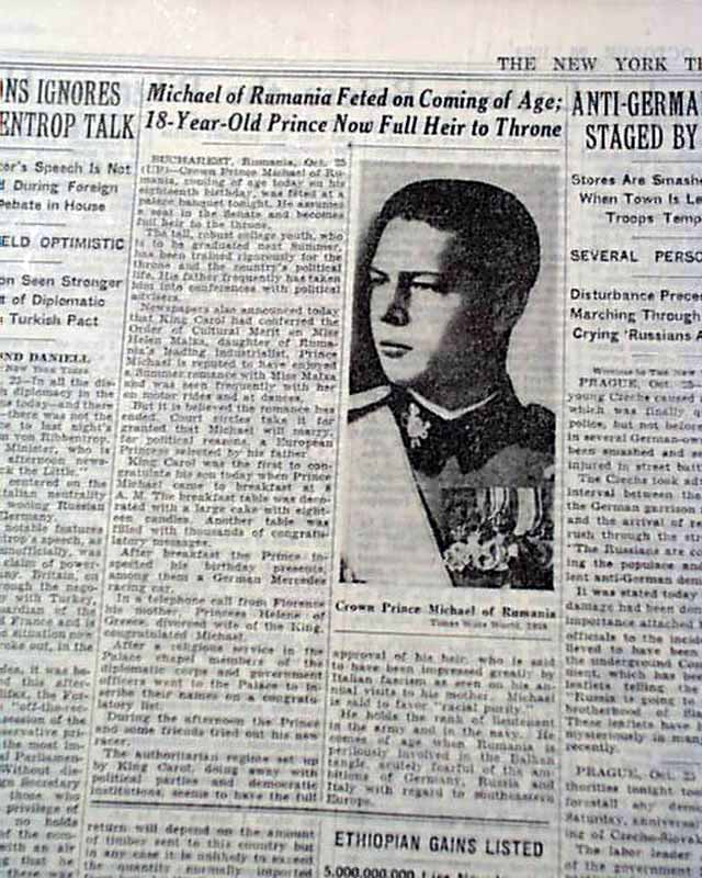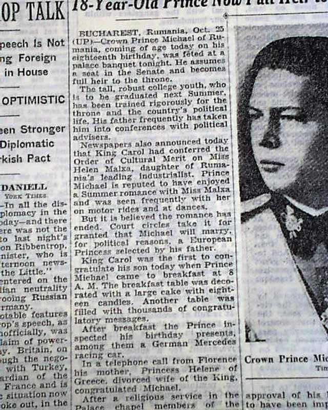 The top of page 3 has a two column heading: "Michael of Romania Feted on Coming of Age; 18-Year-Old-Prince Now Full Heir to Throne" with photo. (see) First report coverage on Michael I of Romania turning 18 years old which automatically made him a member of the Senate of Romania.