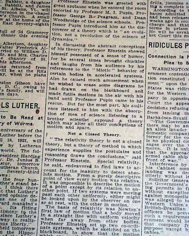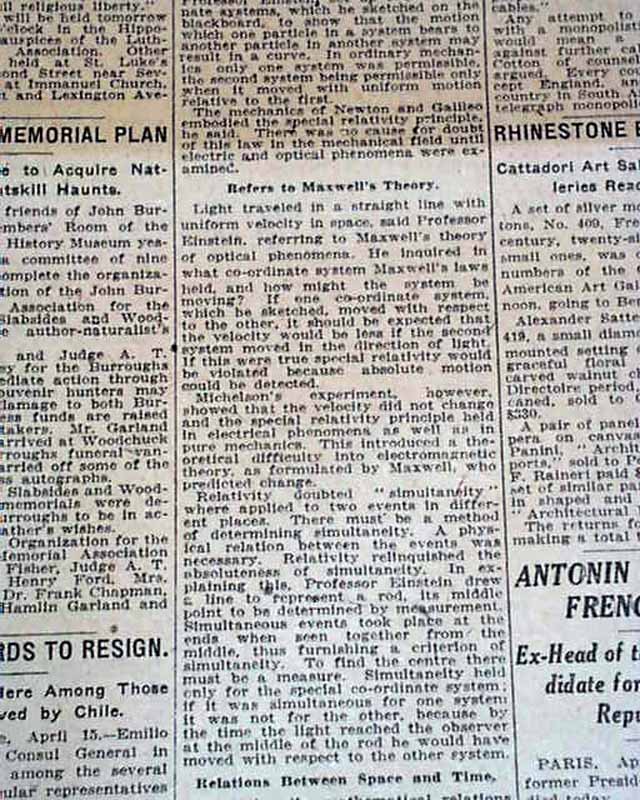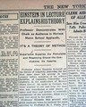 Page 11 has one column headings: "EINSTEIN IN LECTURE EXPLAINS HIS THEORY" "Professor Demonstrates With Chalk as Audience in Horace Mann School Applauds" and more. (see)