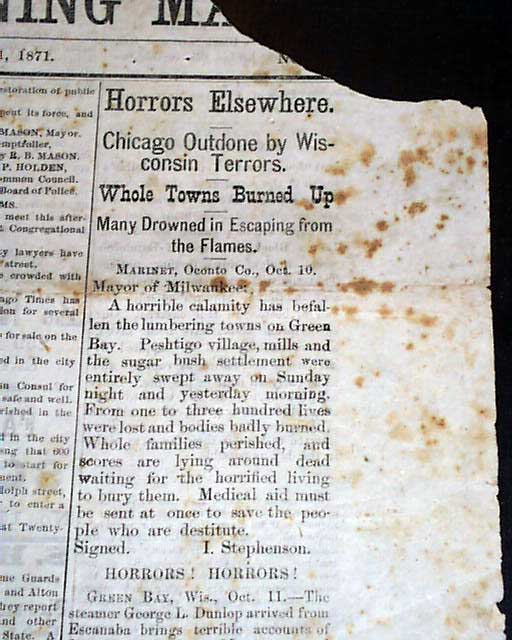 Curiously another fire in Wisconsin raged at the same time & it was deadlier than the Chicago fire, with heads: "Horrors Elsewhere" "Chicago Outdone by Wisconsin Terrors ""Whole Towns Burned Up" "Many Drowned in Escaping from the Flames".