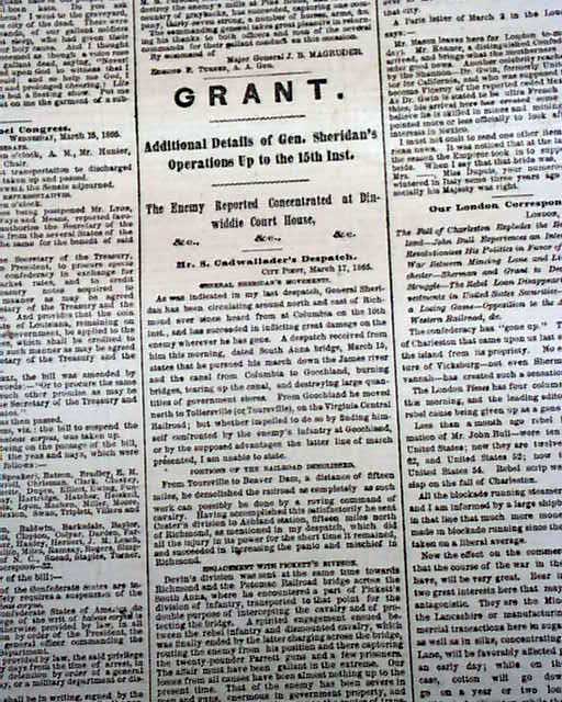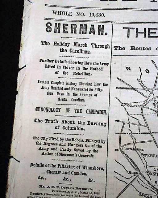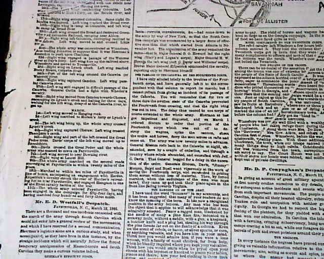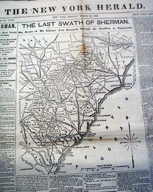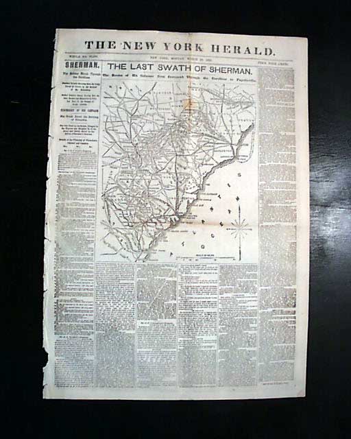 NEW YORK HERALD, March 20, 1865 A great graphic issue on the Civil War featuring a terrific front page map headed: "THE LAST SWATH OF SHERMAN--Route of His Columns from Savannah Through the Carolinas to Fayetteville."