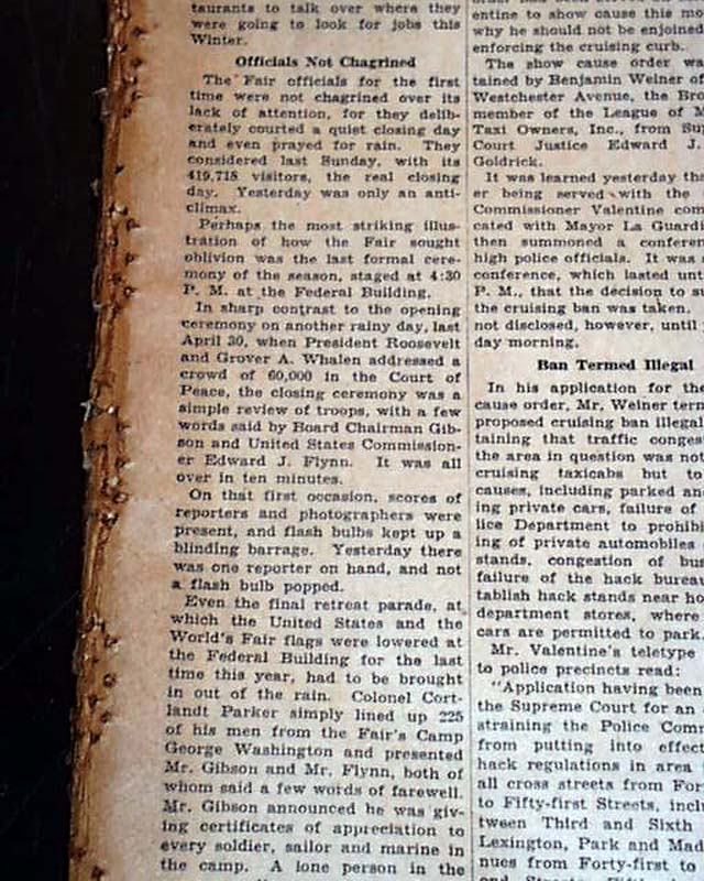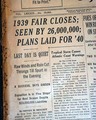 The top of the front page has a two column headline: "1939 FAIR CLOSES; SEEN BY 26,000,000; PLANS LAID FOR '40" with subheads. (see photos) More on page 17. Always nice to have notable events in history reported in this World famous publication, especially on this topic.