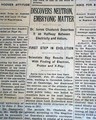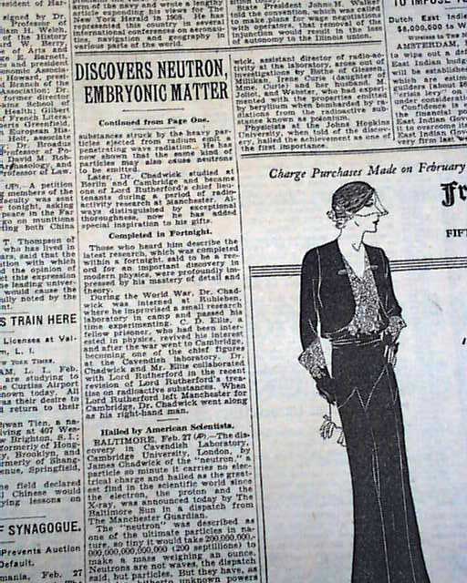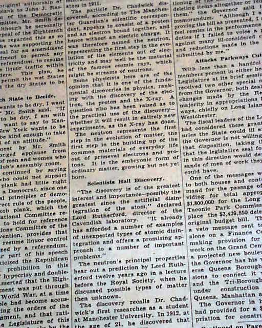 The front page has a one column heading: "DISCOVERS NEUTRON, EMBRYONIC MATTER" with subheads. First report coverage on the discovery of the neutron by English physicist James Chadwick. He would win the Nobel Prize in Physics for this famous discovery.