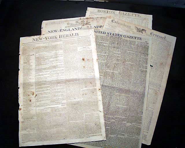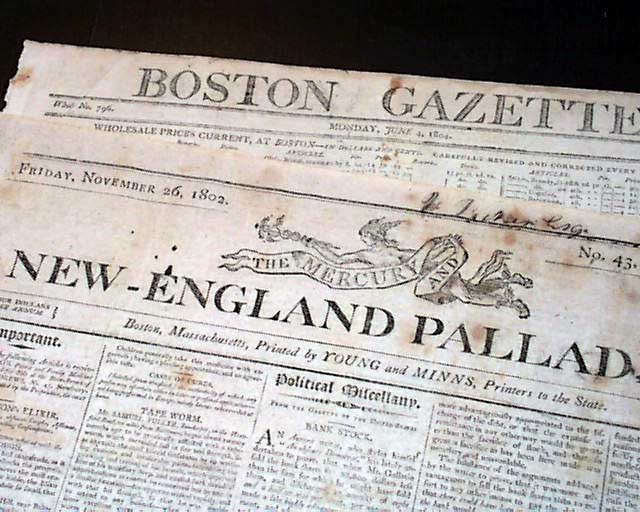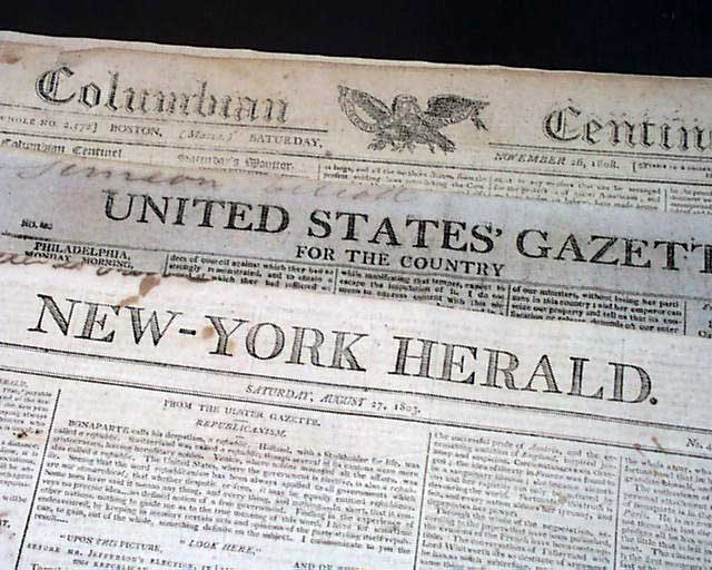 Five very early 19th century American newspapers: New York Herald, Aug. 27, 1803; United States' Gazette, Oct. 23, 1809; Columbian Centinel, Nov. 26, 1808; New England Palladium, Nov. 26, 1802; and Boston Gazette, June 4, 1804. All five are good "newsy" newspapers of folio size, 4 pages, some margin tears, generally good condition. A nice set of five different, early newspapers.