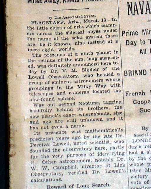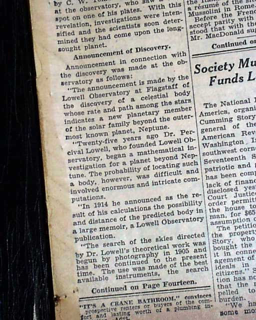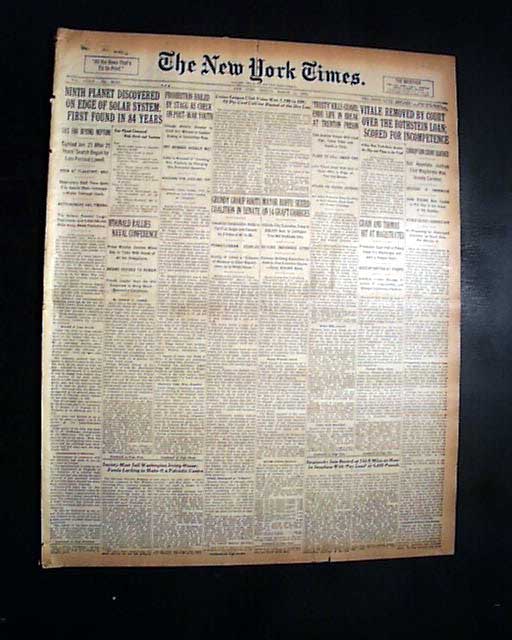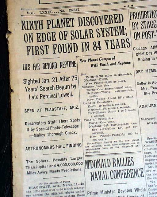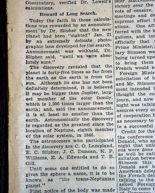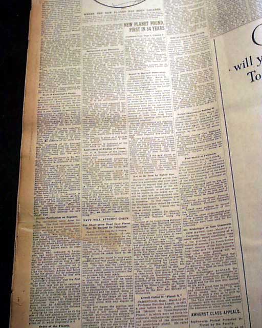 The top of the front page has a two column headline: "NINTH PLANET DISCOVERED ON EDGE OF SOLAR SYSTEM; FIRST FOUND IN 84 YEARS" with subheads. (see) First report coverage continues on page 8 with related diagram. Loads of text, too much to photograph all. Always nice to have notable events in history reported in this World famous publication.