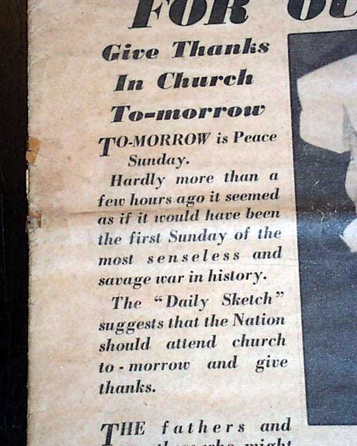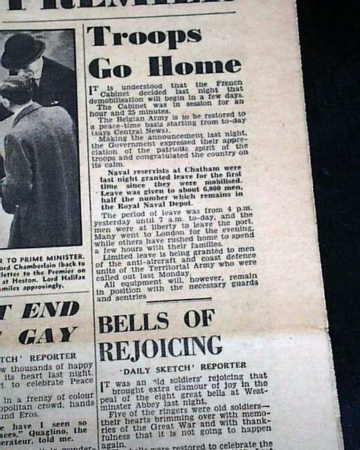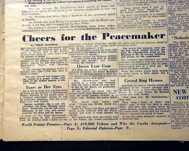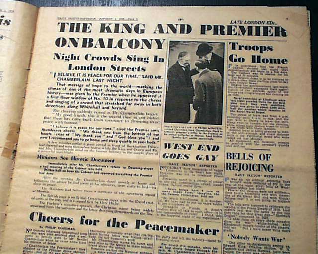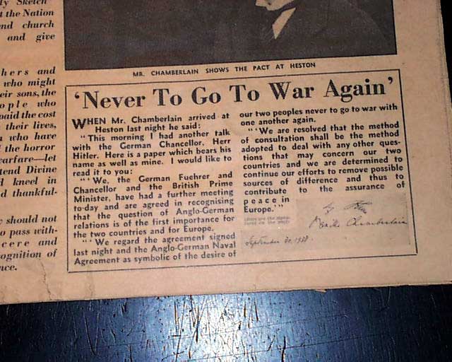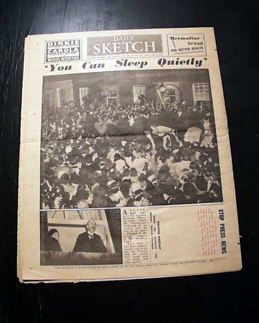 DAILY SKETCH, London, Oct. 1, 1938  The day prior British Prime Minster Neville Chamberlain gave a speech concerning the Munich Agreement and the Anglo-German Declaration and assured the British people that: "...it is peace for our time".