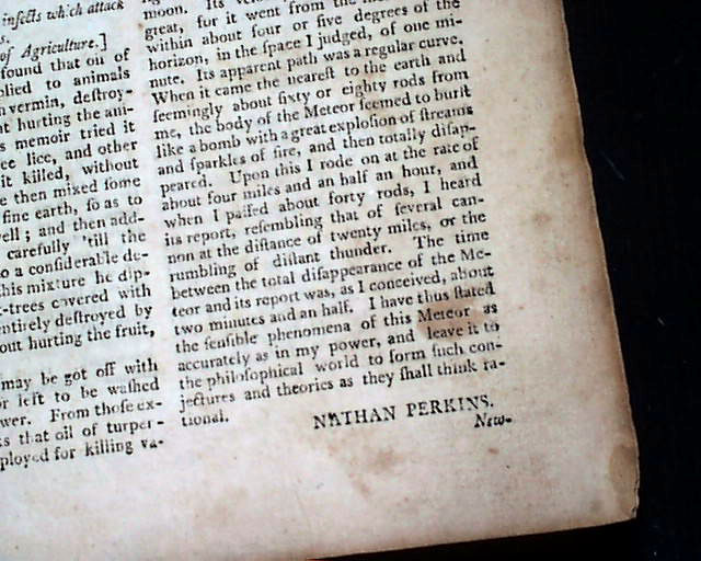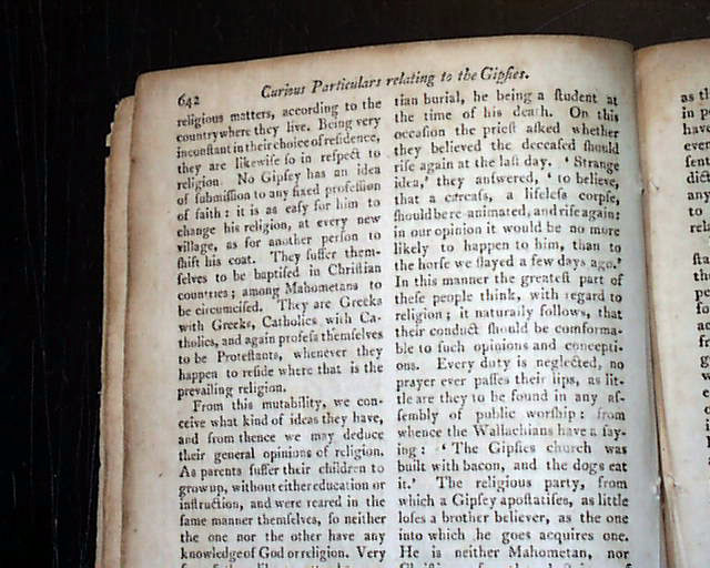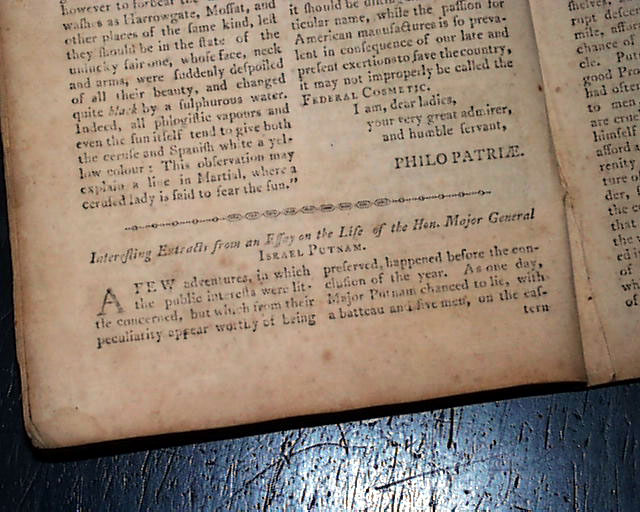 Articles include: "To the Ladies on the Use of Cosmetics" "Interesting Extracts from the Life of General Putnam" which takes over 8 pages; "On the Religion, Language & Sciences of the Gypsies" "An Account of Campus Martius at the City of Marietta, Territory of the United States North-West of the River Ohio". Marietta was the first permanent settlement in the Northwest Territory. The accompanying plate of Campus Martius is lacking, as is the other unrelated plate called for.