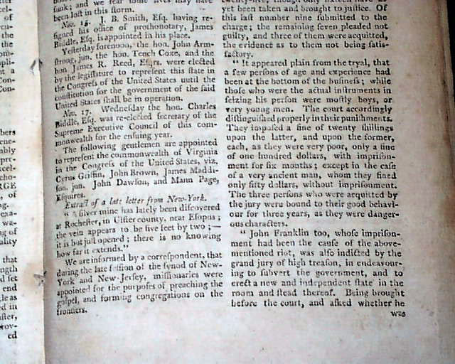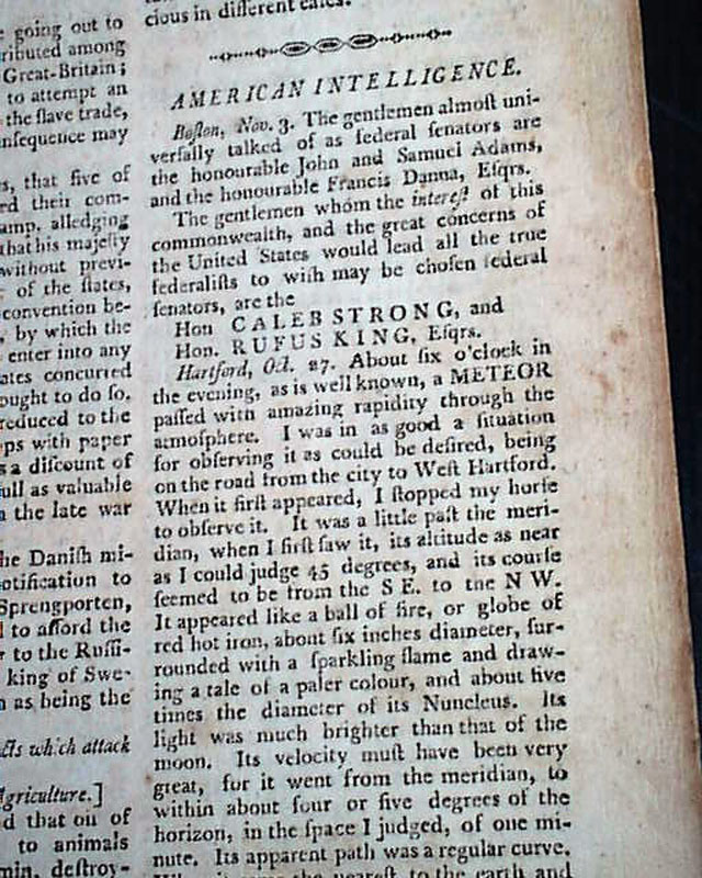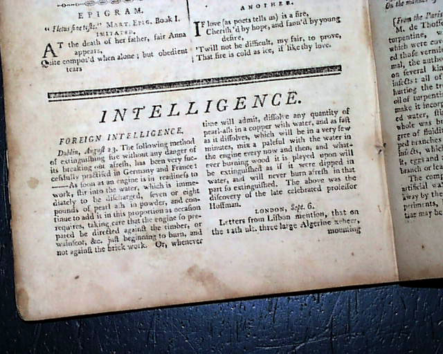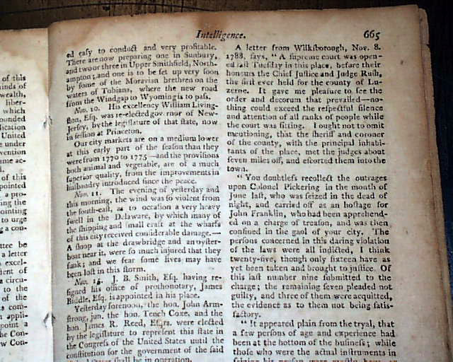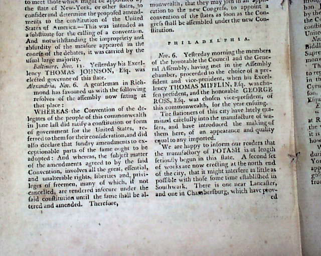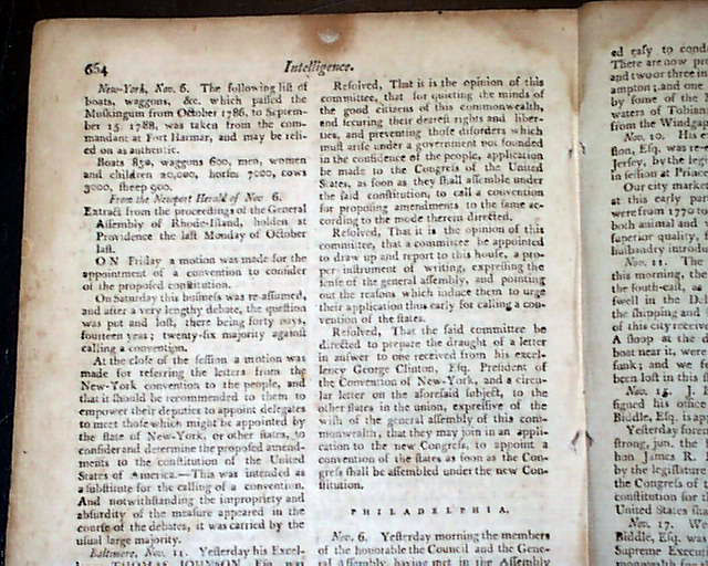 Near the back is: "American Intelligence" with the latest news reports of the day including nice details on the state of Maryland calling for a convention to discuss & hopefully ratify the newly proposed federal Constitution. Other news reports as well.