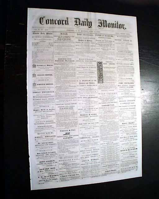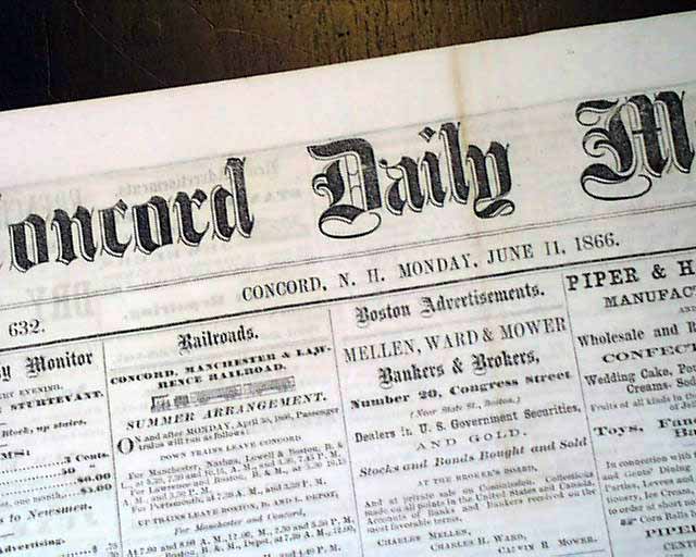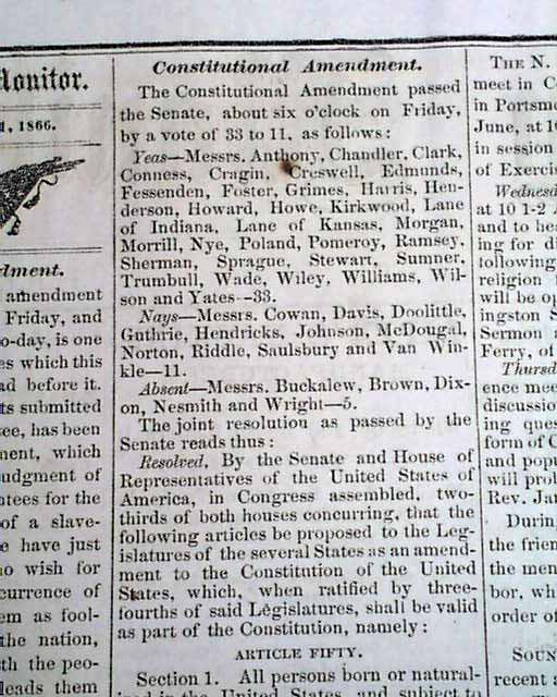 CONCORD DAILY MONITOR, New Hampshire, June 11, 1866 The top of page 2 has: "Constitutional Amendment" which begins: "The Constitutional Amendment passed the Senate, about six o'clock on Friday, by a vote of 33 to 11, as followed..." with a list of those who voted. This is followed by the full text of the historic Fourteenth Amendment, all five sections (see).