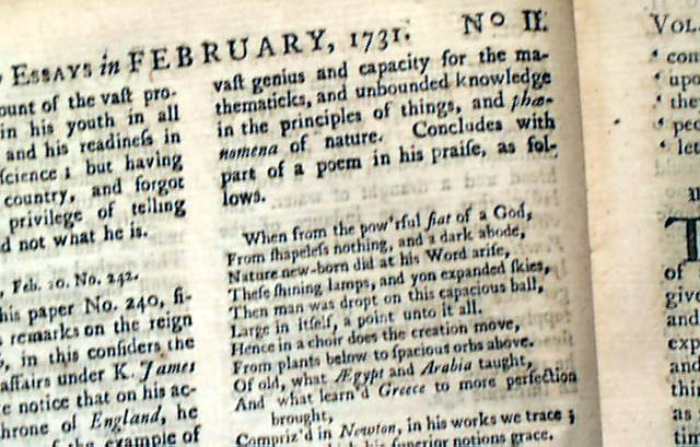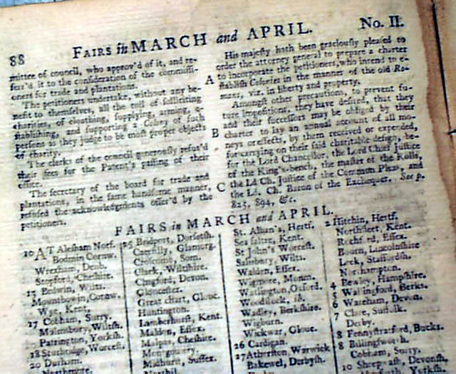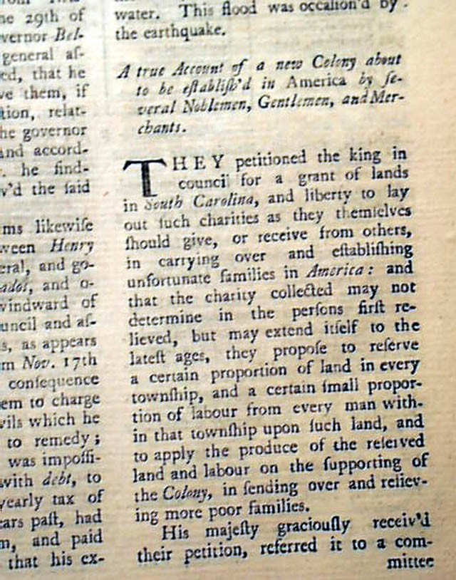 Another significant item is one of the earliest reports to be had on what would be the creation of the Georgia colony, headed: "A true Account of a new Colony about to be Establish'd in America by several Noblemen, Gentlemen, and Merchants." taking over half a page.