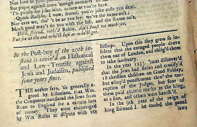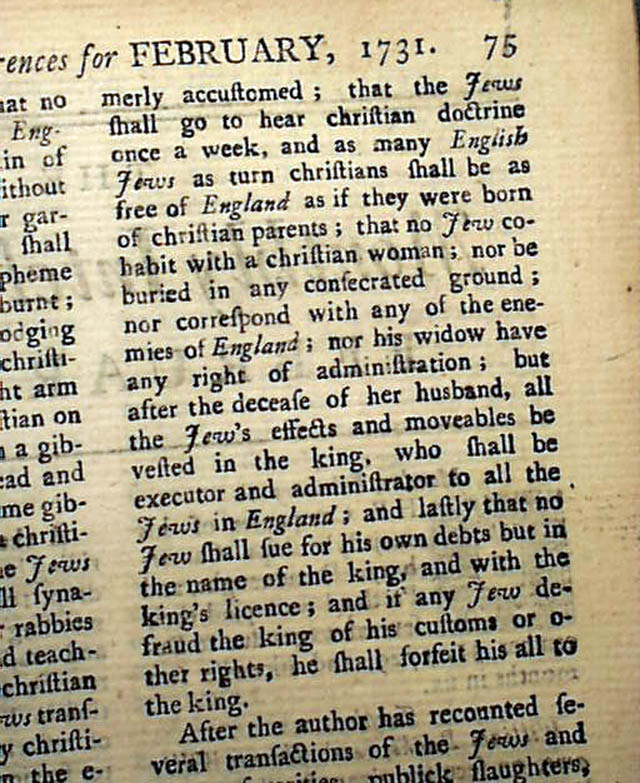Item # 667385 THE GENTLEMAN'S MAGAZINE, London, February, 1731 There are several notable articles in this issue, including over a full page on: "...an Historical and Law-Treatise Against Jews and Judaism, published some years since."