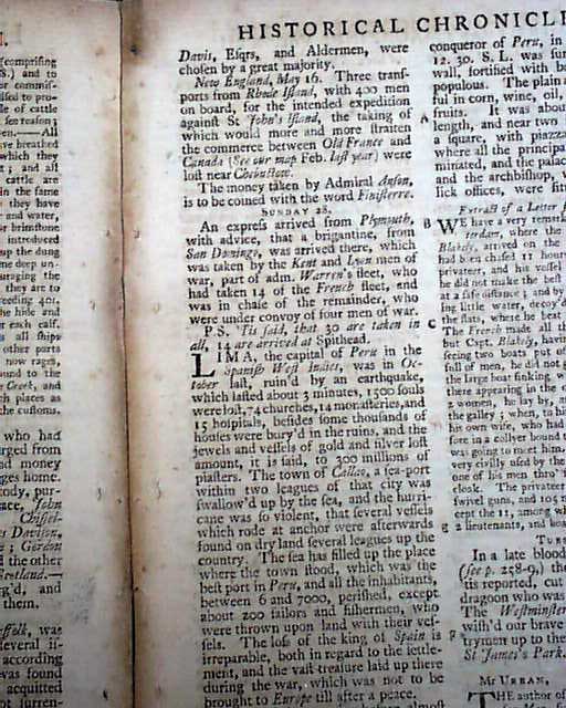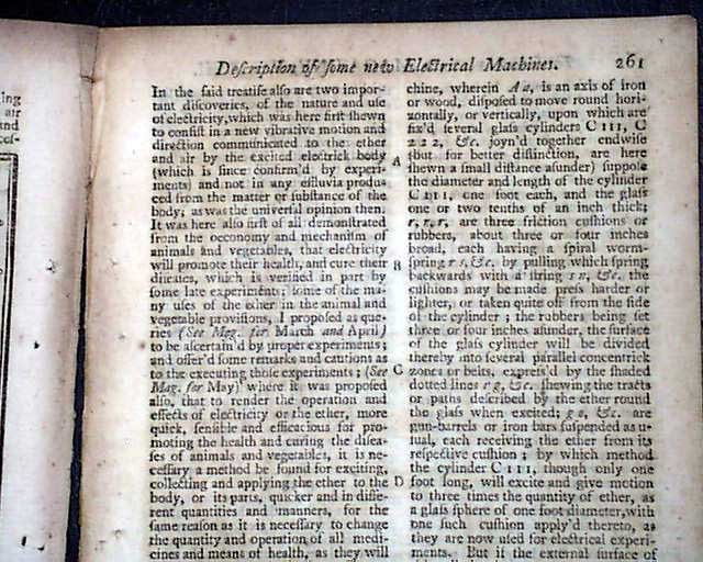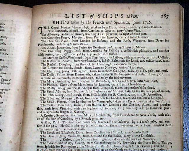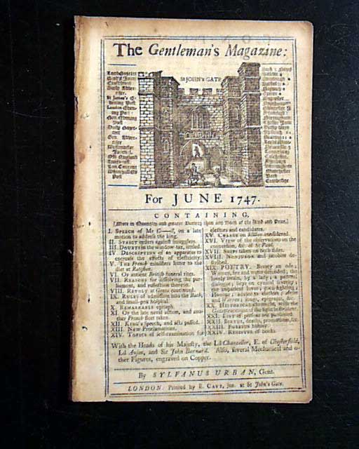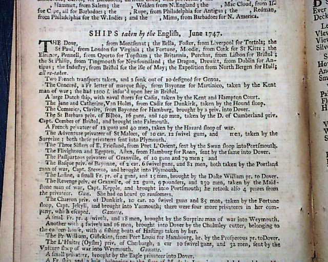THE GENTLEMAN'S MAGAZINE, London, June, 1747 Two pages are taken up with a: "List of Ships Taken" which include several bound to or from North America and the West Indies. Also included are articles on some early electric machines including a illustration.