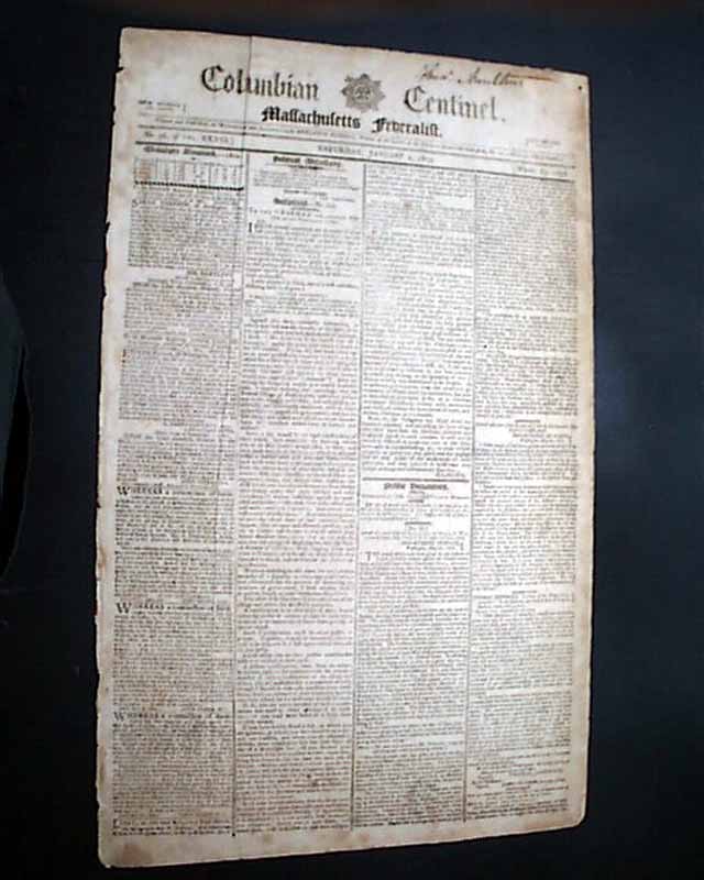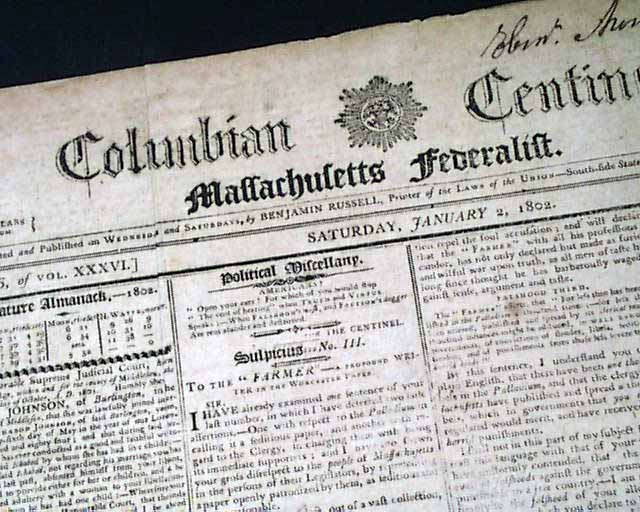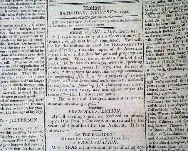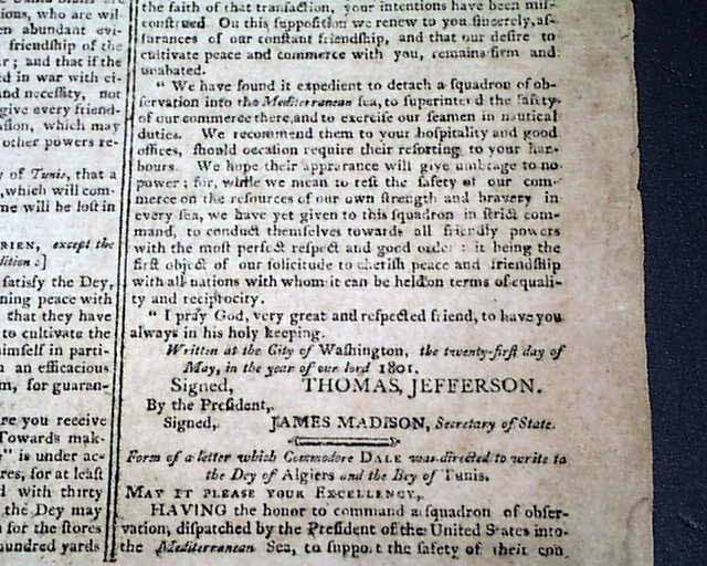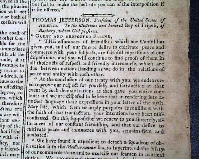 COLUMBIAN CENTINEL, Boston, Jan. 3, 1802 The front page has a letter to the "...honored Bey of Tripoli, of Barbary..." concerning the on-going Barbary War, signed in type: Thomas Jefferson and James Madison.