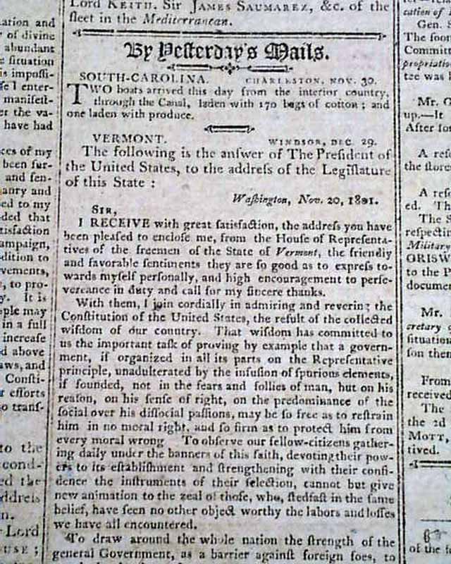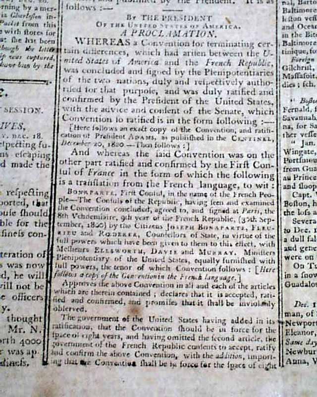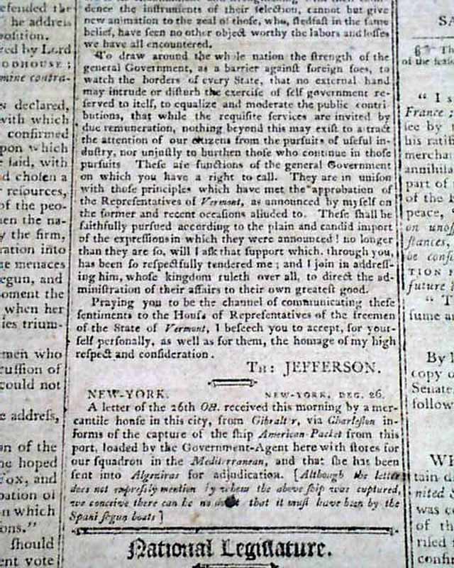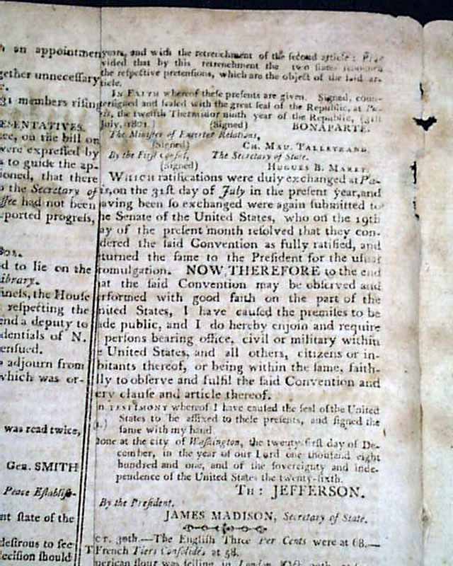Page 2 has: "A Proclamation" signed by: Th. Jefferson concerning France, within which is a letter signed in type by: Bonaparte. Also has a half column letter to the legislature of Vermont, signed in type: Th. Jefferson.