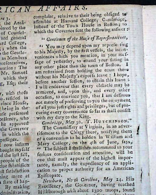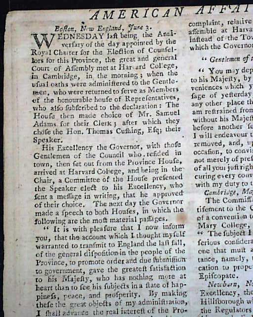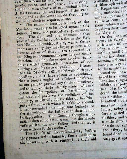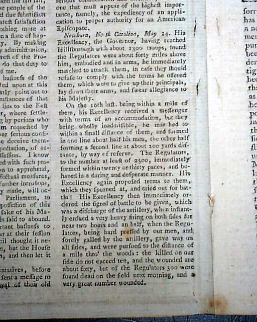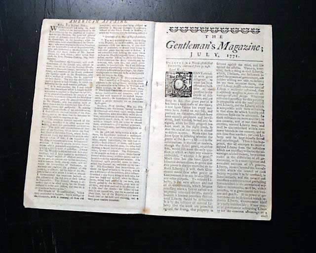 Item # 667902 GENTLEMAN'S MAGAZINE, London, July, 1771 The key content in this issue is inside the title page, headed: "American Affairs" being a report on what most historians describe as the first shedding of blood of the war for American independence. A report from: "Newburn, North Carolina" [New Bern], states in part: "His Excellency, the Governor, having reached Hillsborough with about 1,300 troops, found the Regulators were about 40 miles above him, embodied and in arms, he immediately marched to attack them in case they should refuse to comply with the terms...which were to give up their principals, lay down their arms & swear allegiance to his Majesty...". It continues: "...his Excellency received a messenger with terms... but they being wholly inadmissible, he marched...". Additional text includes details of the ensuing battle, including the death count. This was later to become known as the Battle of Alamance.