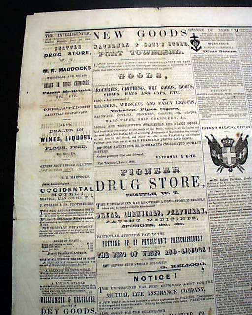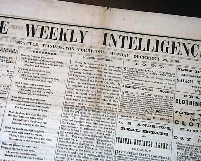 THE WEEKLY INTELLIGENCER, Seattle, Washington Territory, Dec. 28, 1868 Not only is this the earliest newspaper we have offered from Seattle, this was printed 21 years before Washington would become a state. "Union List of Newspapers" notes only two institutions have issues from 1868.
