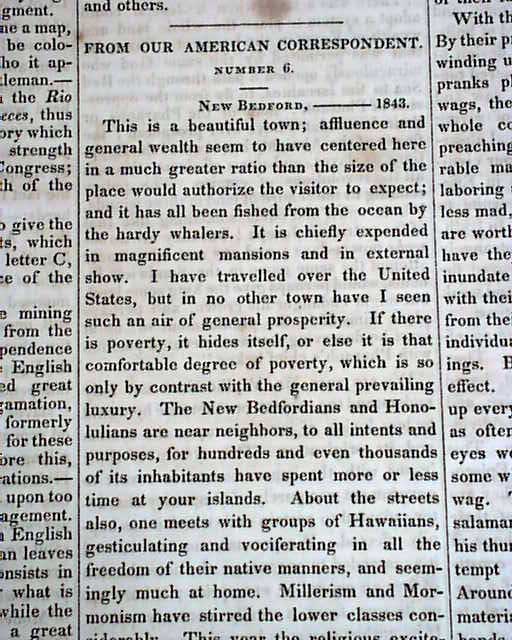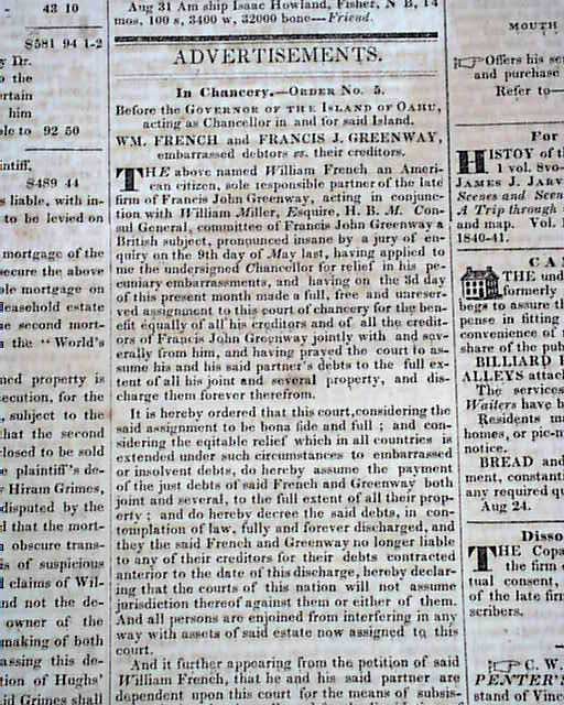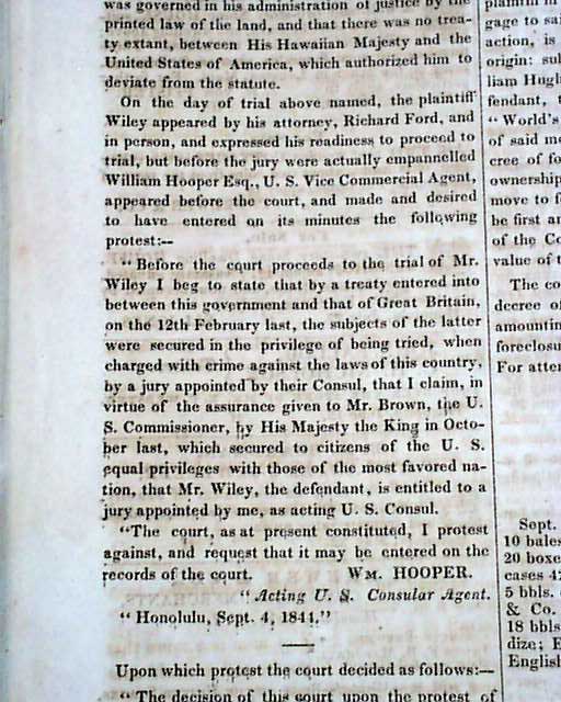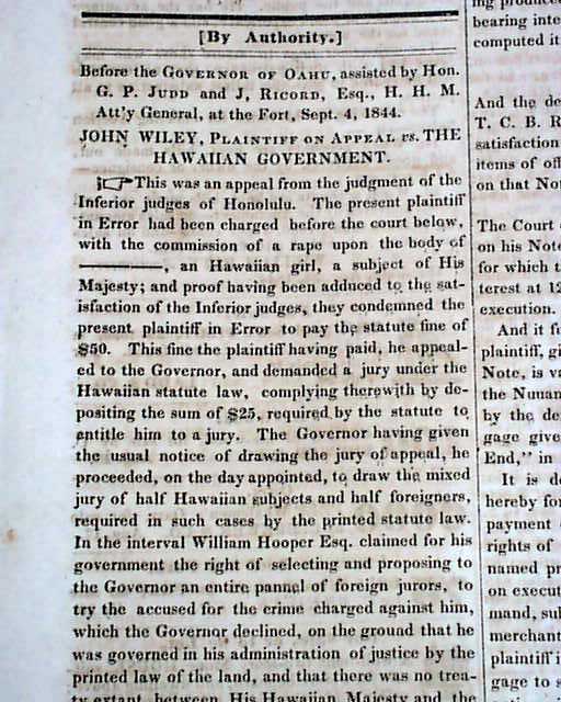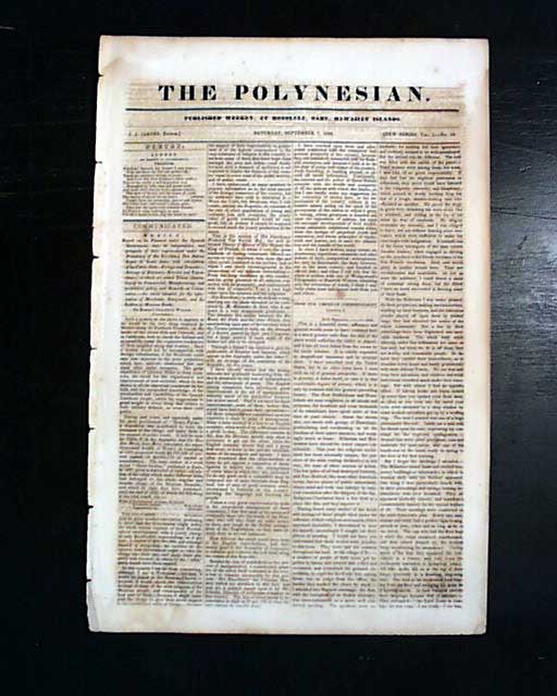 THE POLYNESIAN, Honolulu, Oahu, Hawaiian Islands, Sept. 7, 1844  One of the earliest newspapers we have offered from Hawaii, and fourteen years earlier than the few of this title we offered in recent years.