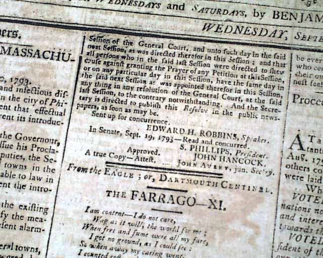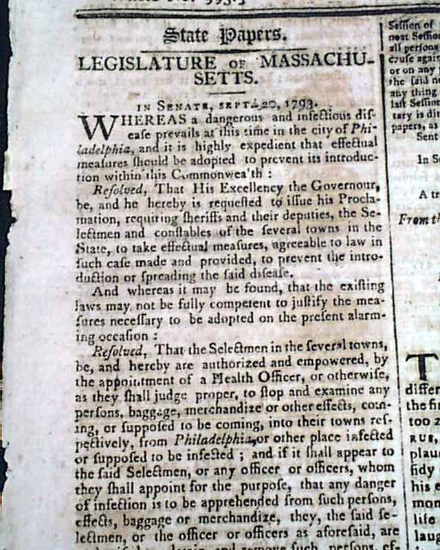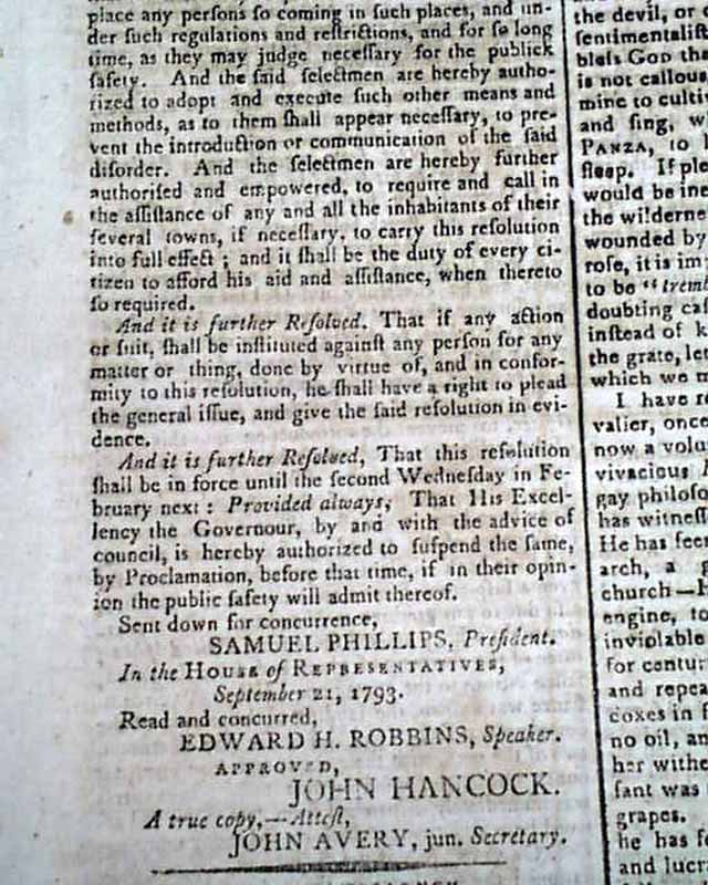 The front page begins with a document from Massachusetts on the restrictions to be enforced due to the spread of the Yellow Fever epidemic centered at Philadelphia, signed in type by the governor: John Hancock.