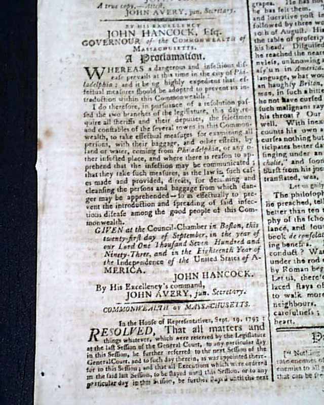 This is followed by "A Proclamation" from him also relating to the: "...dangerous and infectious disease...prevails at this time..." also signed: John Hancock, and yet a third document signed: John Hancock.