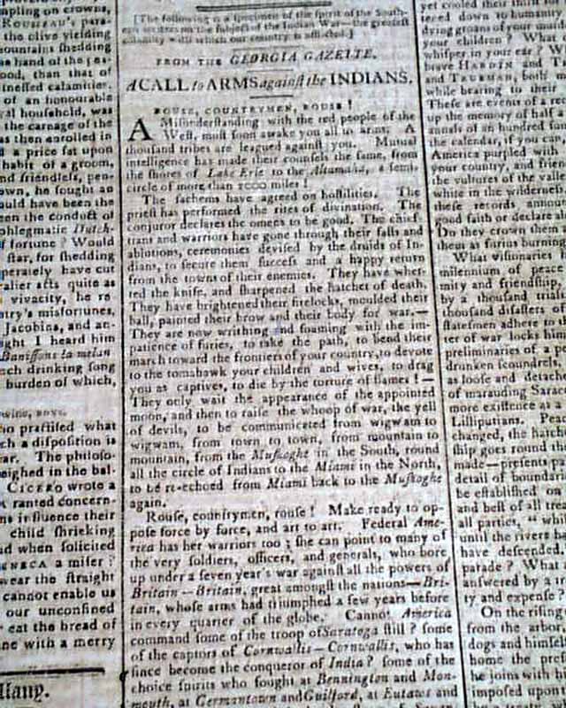 There is also a lengthy: "A Call to Army Against the Indians - Rouse, Countrymen, Rouse!" taken from the Georgia Gazette. It begins: "A misunderstanding with the red people of the West must soon awake you all to arms. A thousand tribes are leagued against you...The sachems have agreed on hostilities...Rouse, countrymen, rouse! Make ready to oppose force by force..." and much more, carrying over to page 2.