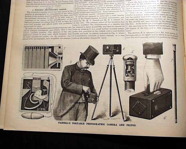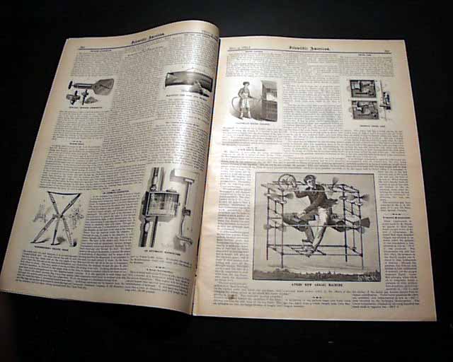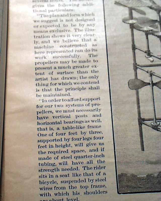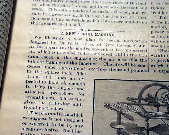 Page 5 has a fascinating print of: "Ayres' New Aerial Machine" with a related article: "A New Aerial Machine" with much detail on how this machine would work. It even notes: "...illustrations shows it very clearly and we believe that a machine constructed as here represented can do its work successfully...". Fascinating evidence of what the best minds of the 19th century envisioned in their quest for flight.
