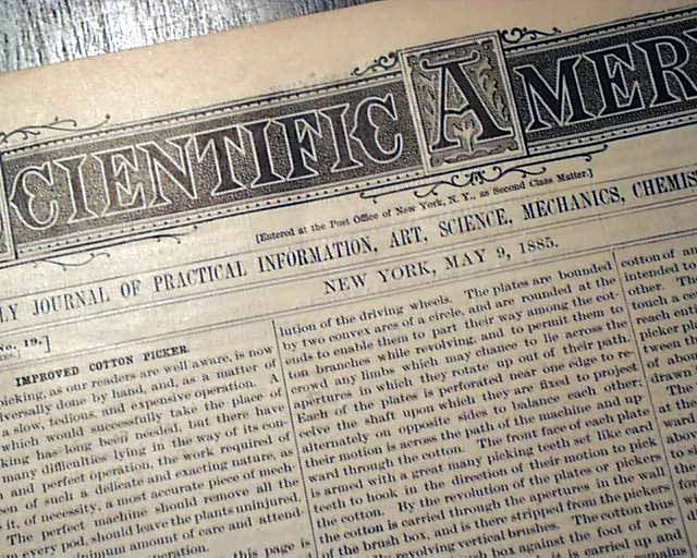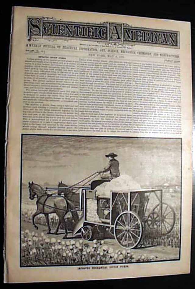 Half of the front page is an illustration of the: "Improved Mechanical Cotton Picker" and the balance is a lengthy article on it. Other scientific improvements & inventions throughout.