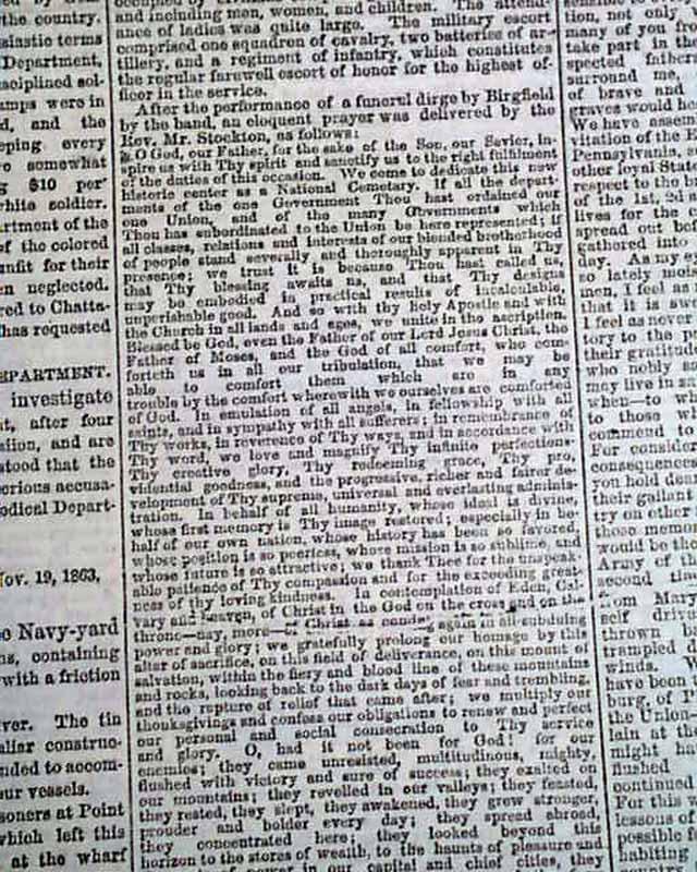 The top of the front page has column heads: "The Gettysburg Cemetery" "The Consecration Ceremonies" "Grant Military and Civic Display" "Speeches by the President, Secretary of State, and Others" "Edward Everett's Address".