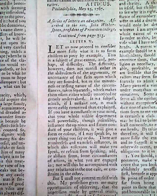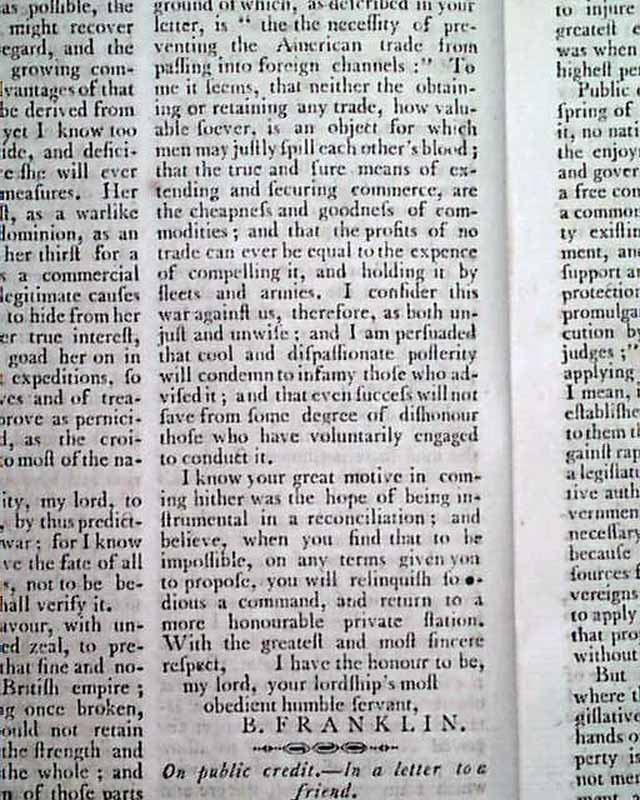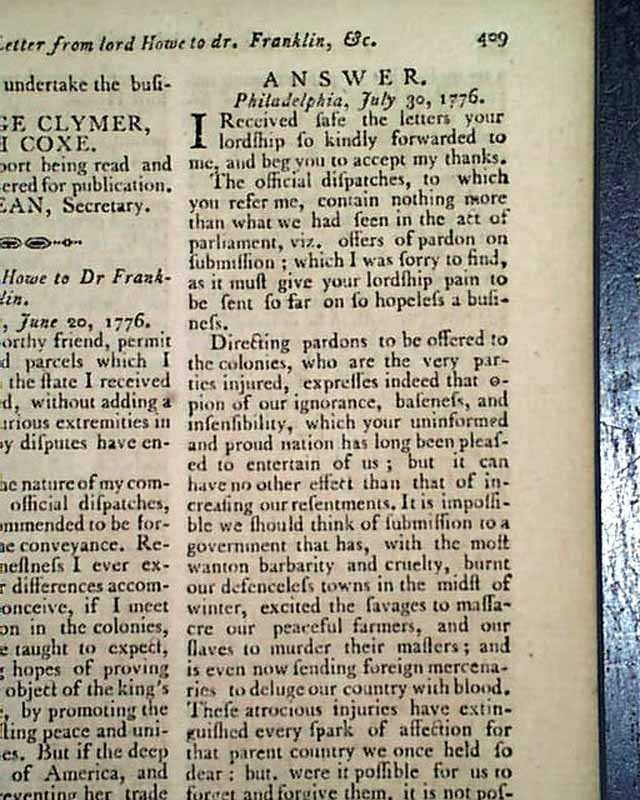 Included is a lengthy article: "A Series of Letters on Education. Ascribed to the Rev. John Witherspoon, President of Princeton College" which is a continued piece, taking 4 1/2 pgs. Also: "Letter from Lord Howe to Dr. Franklin" dated June 20, 1776 & signed by him: Howe. This is followed by Franklin's reply which takes more than a page & is signed in type: B. Franklin.