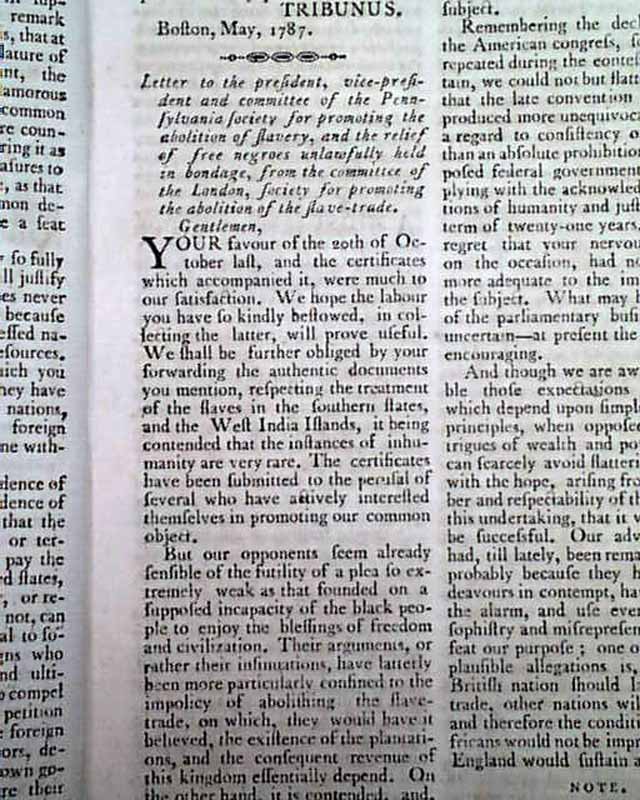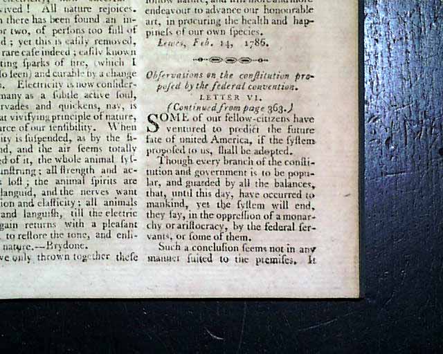 Also included is the 10 page article: "Observations on Capital Punishment", it being an anonymous lengthy response to Dr. Benjamin Rush's essay on this topic which appeared in the July, 1788 issue ("An Enquiry into the Justice and Policy of Punishing Murder by Death") - continued in the December issue.