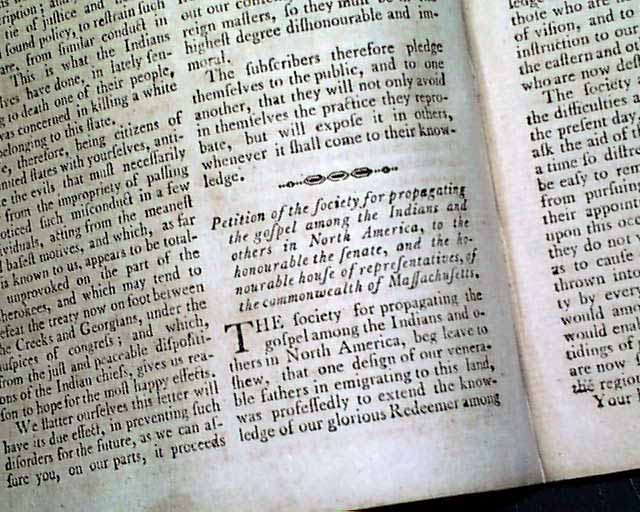 Near the back is: "American intelligence" with news reports from Boston, Charleston, Philadelphia and a letter from Georgia concerning relations with the Indians. The bkpg. is the table of contents).