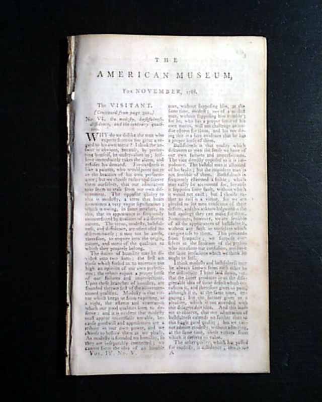 THE AMERICAN MUSEUM, (Philadelphia), Nov., 1788  Eighteenth century American magazines are quite rare, & this was one of the more successful titles from the period.