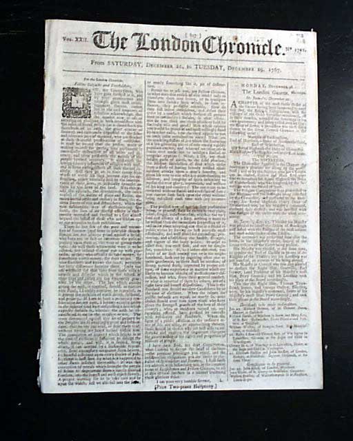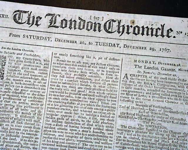 THE LONDON CHRONICLE, England, December 29, 1767 This is a great example of this famous and very successful newspaper from during the troubling years just before the American Revolution, when the relationship between England and the American colonies was growing more and more strained. Virtually all of the content is European in nature, but this issue presents a nice example of the political & cultural temper of the time.