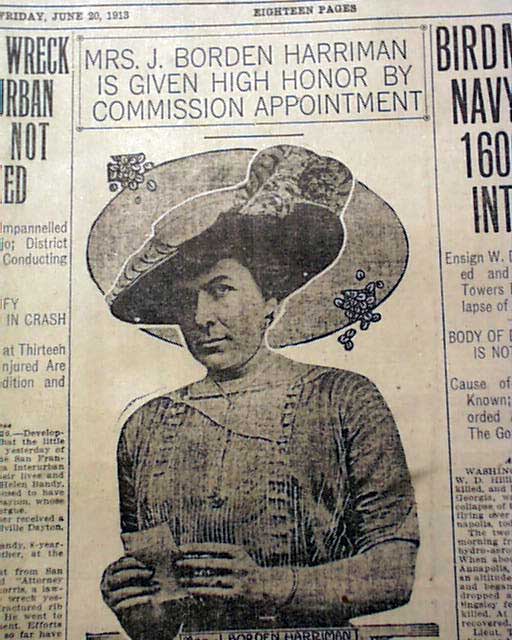 The top of the front page has a two column heading: "Mrs. J. Borden Harriman Is Given High Honor By Commission Appointment" with subhead and nice photo.