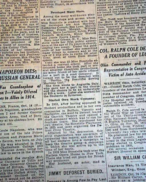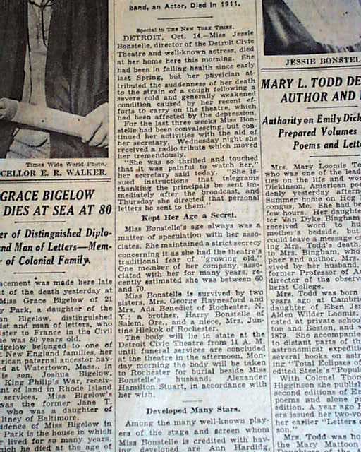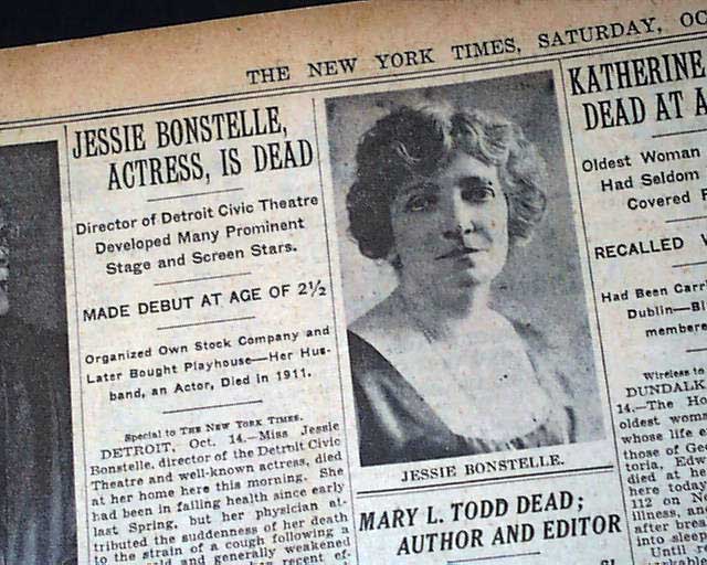 The top of page 15 has a one column heading: "JESSIE BONSTELLE, ACTRESS, IS DEAD" with subheads and photo. (see)