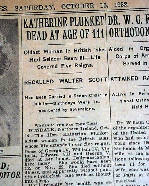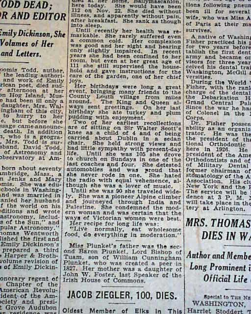Also on the same page is: "KATHERINE PLUNKET DEAD AT AGE OF 111" with subheads. (see) I suspect this is one of the few publications to report these deaths as other titles in our inventory do not.